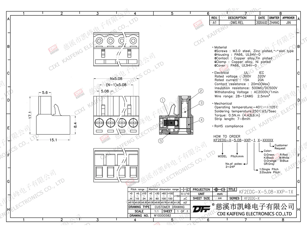 Pluggable Terminal Block MATERIAL:M3.0 Steel Galvanized contact: Phosphor bronzePin header:-Housing: PA66,UL94V-0ElectricalULIECRated voltage300V 320V Rated current15A20AContact resistance20mΩInsulation resistance500MΩ/DC500VWithstanding voltage AC2000V/1minWire range28-12AWG 2.5㎜²MechanicalTemp.rang-40℃~+105℃ Max.soldering+250℃,5se