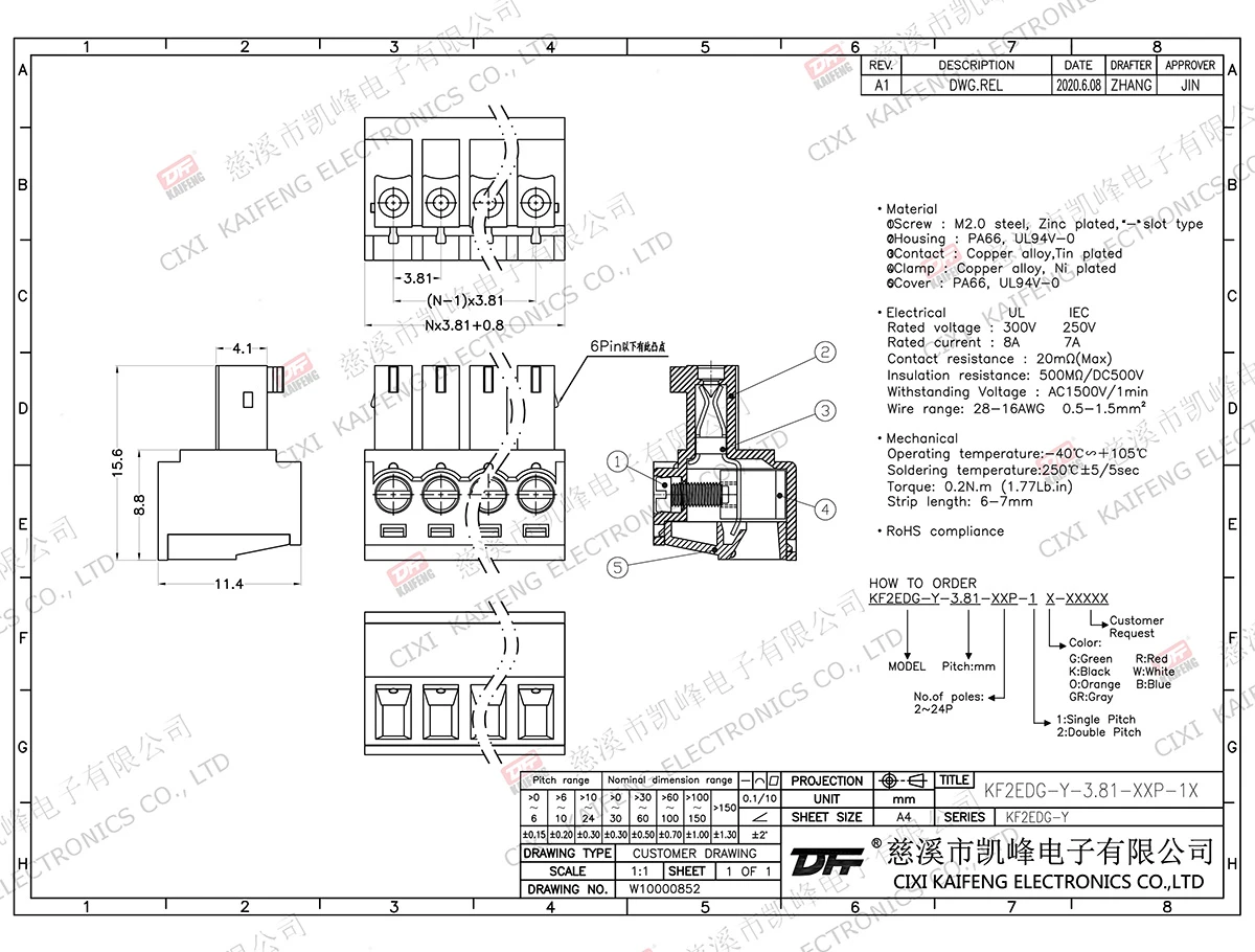 Pluggable Terminal Block MATERIAL:M2.0,Steel Zinc platedcontact: Phosphor bronzePin header: -Housing: PA66,UL94V-0ElectricalULIECRated voltage300V 250V Rated current8A7AContact resistance20mΩInsulation resistance500MΩ/DC500VWithstanding voltage AC1500V/1minWire range28-16AWG 0.5-1.5mm²MechanicalTemp.rang-40℃~+105℃ Max.soldering+250℃,