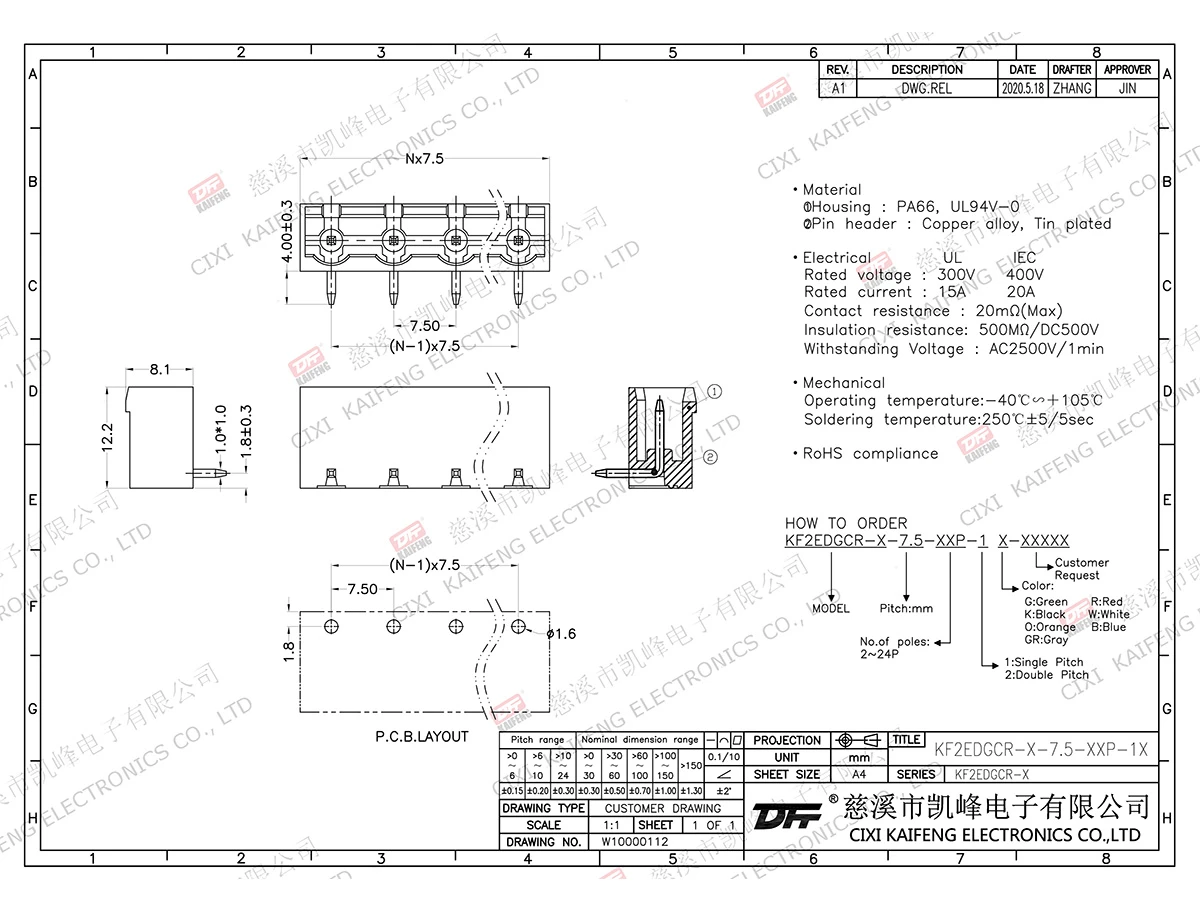 MATERIAL:contact: -Pin header: Brass, Tin platedHousing: PA66,UL94V-0ElectricalULIECRated voltage300V 400V Rated current15A20AContact resistance20mΩInsulation resistance500MΩ/DC500VWithstanding voltage AC2500V/1minWire range-MechanicalTemp.rang-40℃~+105℃ Max.soldering+250℃, 5secTorque-Strip length-