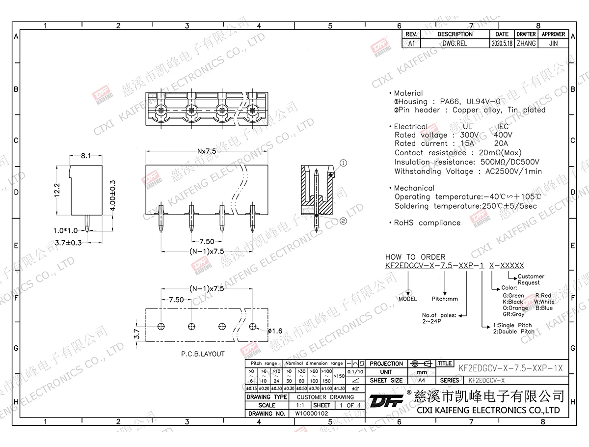 MATERIAL:M3.0,SteelClip: -contact: -Pin header: Brass, Tin platedHousing: PA66,UL94V-0ElectricalULIECRated voltage300V 400V Rated current15A20AContact resistance20mΩInsulation resistance500MΩ/DC500VWithstanding voltage AC2500V/1minWire range-MechanicalTemp.rang-40℃~+105℃ Max.soldering+250℃, 5secTorque-Strip length-