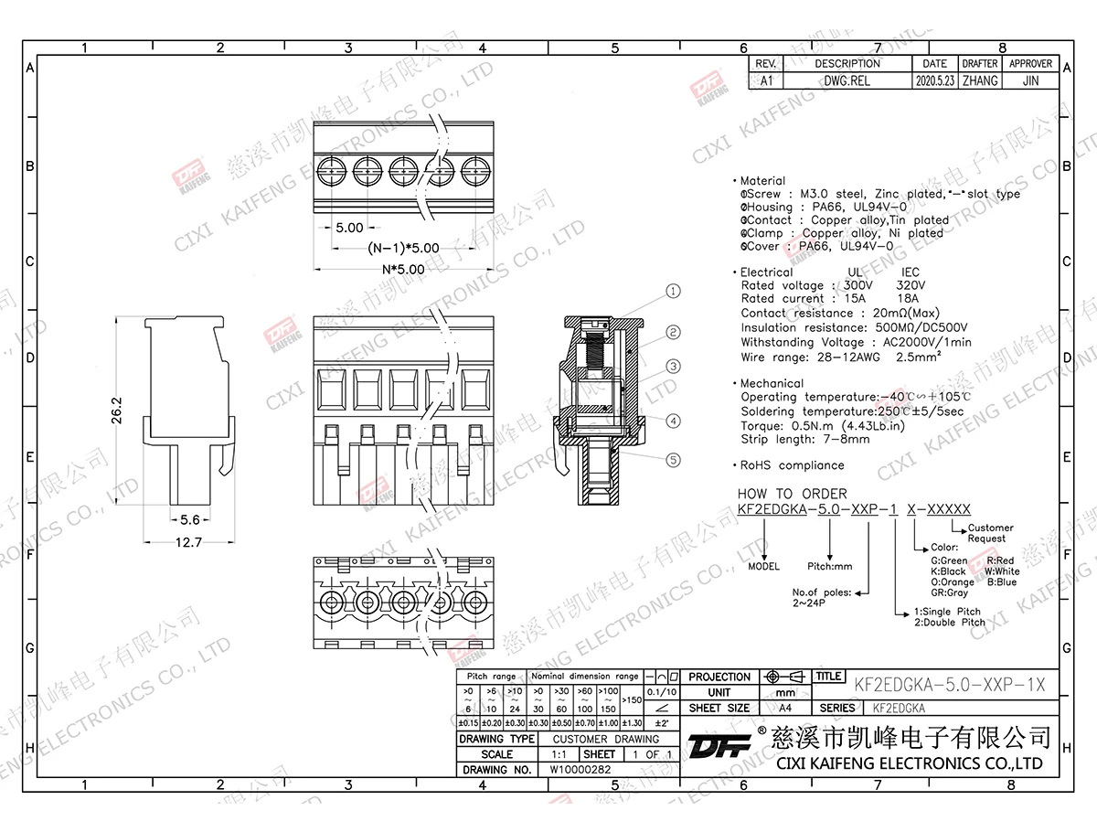 Pluggable Terminal Block MATERIAL:M2.5,Steel Zinc platedcontact: Phosphor bronzePin header: -Housing: PA66,UL94V-0ElectricalULIECRated voltage300V 320V Rated current15A10AContact resistance20mΩInsulation resistance500MΩ/DC500VWithstanding voltage AC2000V/1minWire range28-12AWG 2.5mm²MechanicalTemp.rang-40℃~+105℃ Max.soldering+250℃, 5s