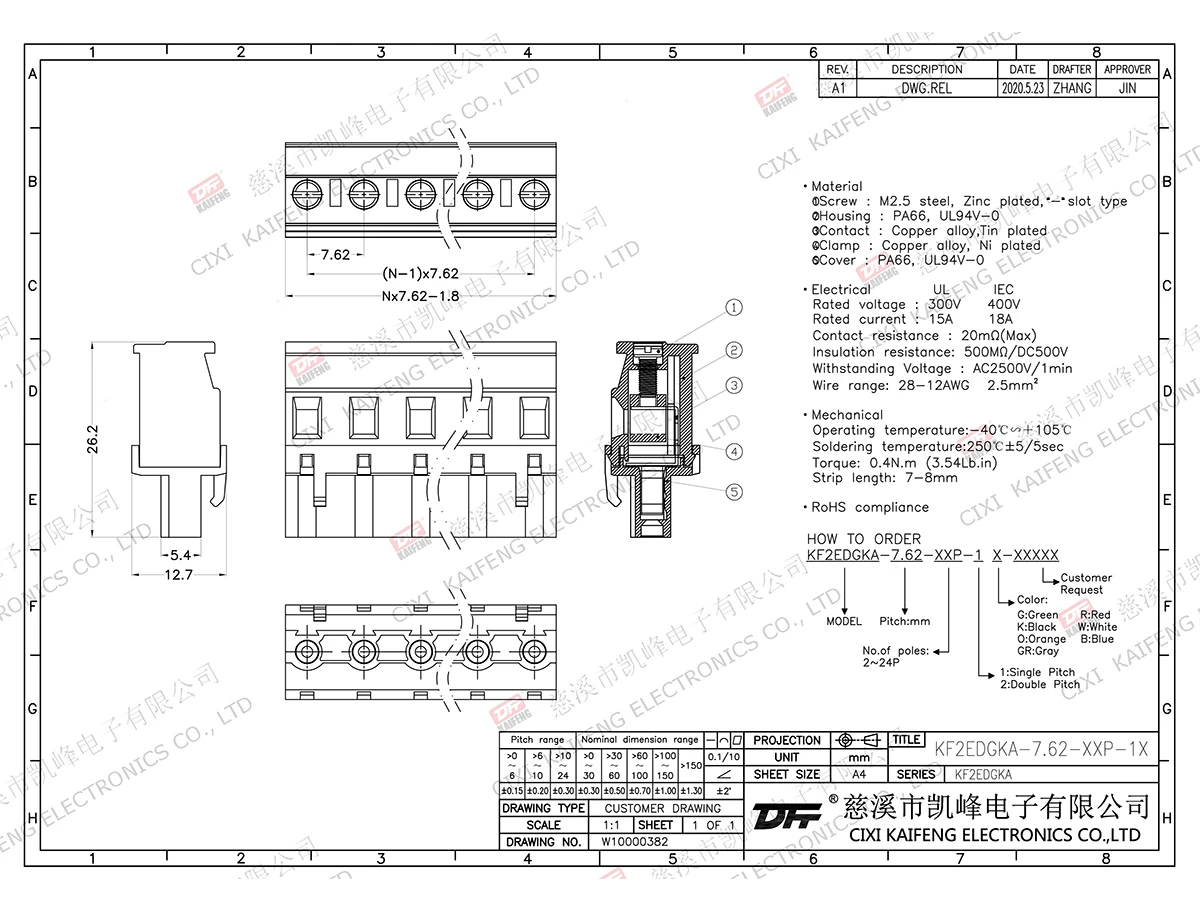 MATERIAL:M2.5,Steel Zinc platedcontact: Phosphor bronzePin header: -Housing: PA66,UL94V-0ElectricalULIECRated voltage300V 400V Rated current15A10AContact resistance20mΩInsulation resistance500MΩ/DC500VWithstanding voltage AC2500V/1minWire range28-12AWG 2.5mm²MechanicalTemp.rang-40℃~+150℃ Max.soldering+250℃, 5s