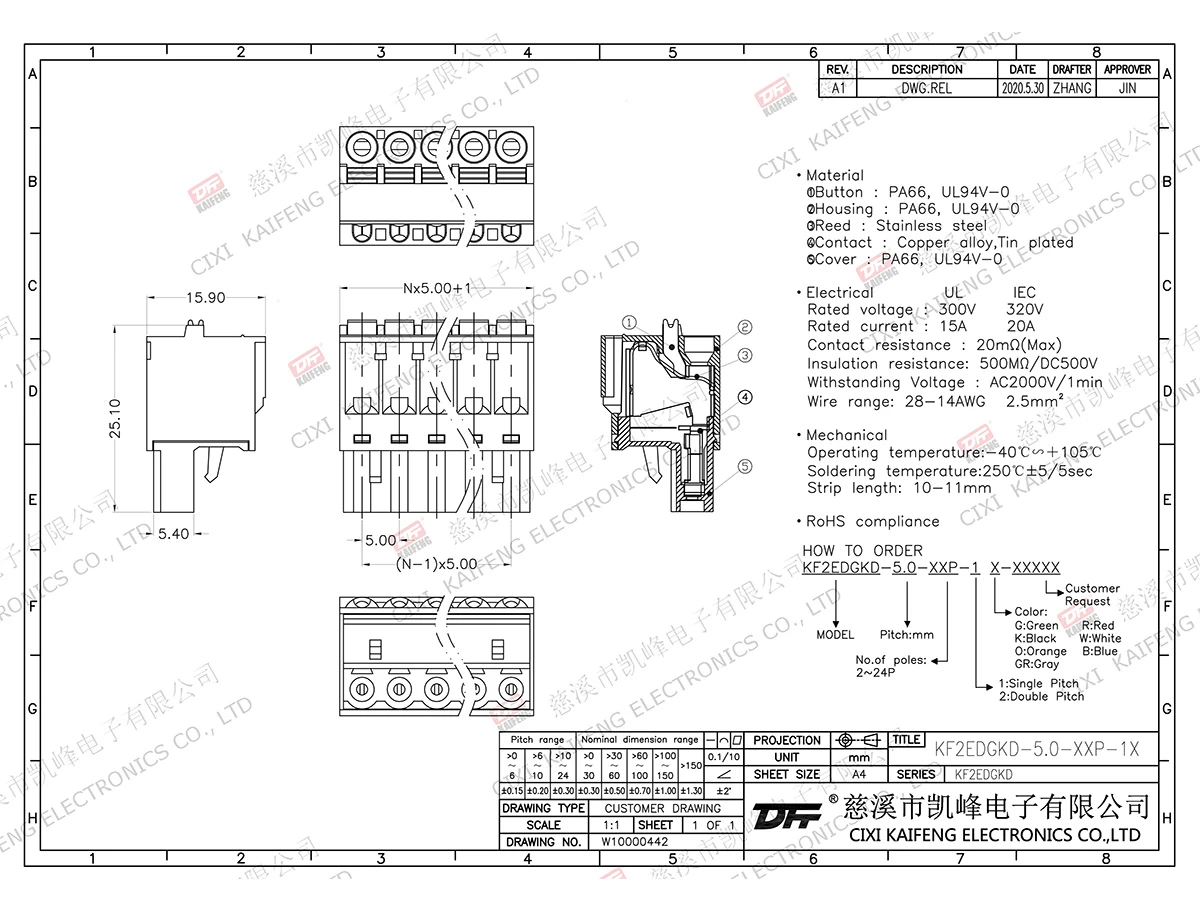 MATERIAL:contact: Phosphor bronzeReed: Stainless steelHousing: PA66,UL94V-0ElectricalULIECRated voltage300V 320V Rated current15A20AContact resistance20mΩInsulation resistance500MΩ/DC500VWithstanding voltage AC2000V/1minWire range28-14AWG 2.5mm²MechanicalTemp.rang-40℃~+105℃ Max.soldering+250℃, 5secTorque-Strip length10