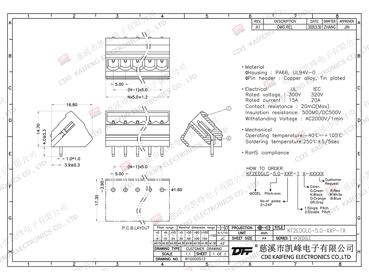 MATERIAL:contact: -Pin header: Brass, Tin platedHousing: PA66,UL94V-0ElectricalULIECRated voltage300V 320V Rated current15A20AContact resistance20mΩInsulation resistance500MΩ/DC500VWithstanding voltage AC2000V/1minWire range-MechanicalTemp.rang-40℃~+105℃ Max.soldering+250℃, 5secTorque-Strip length-