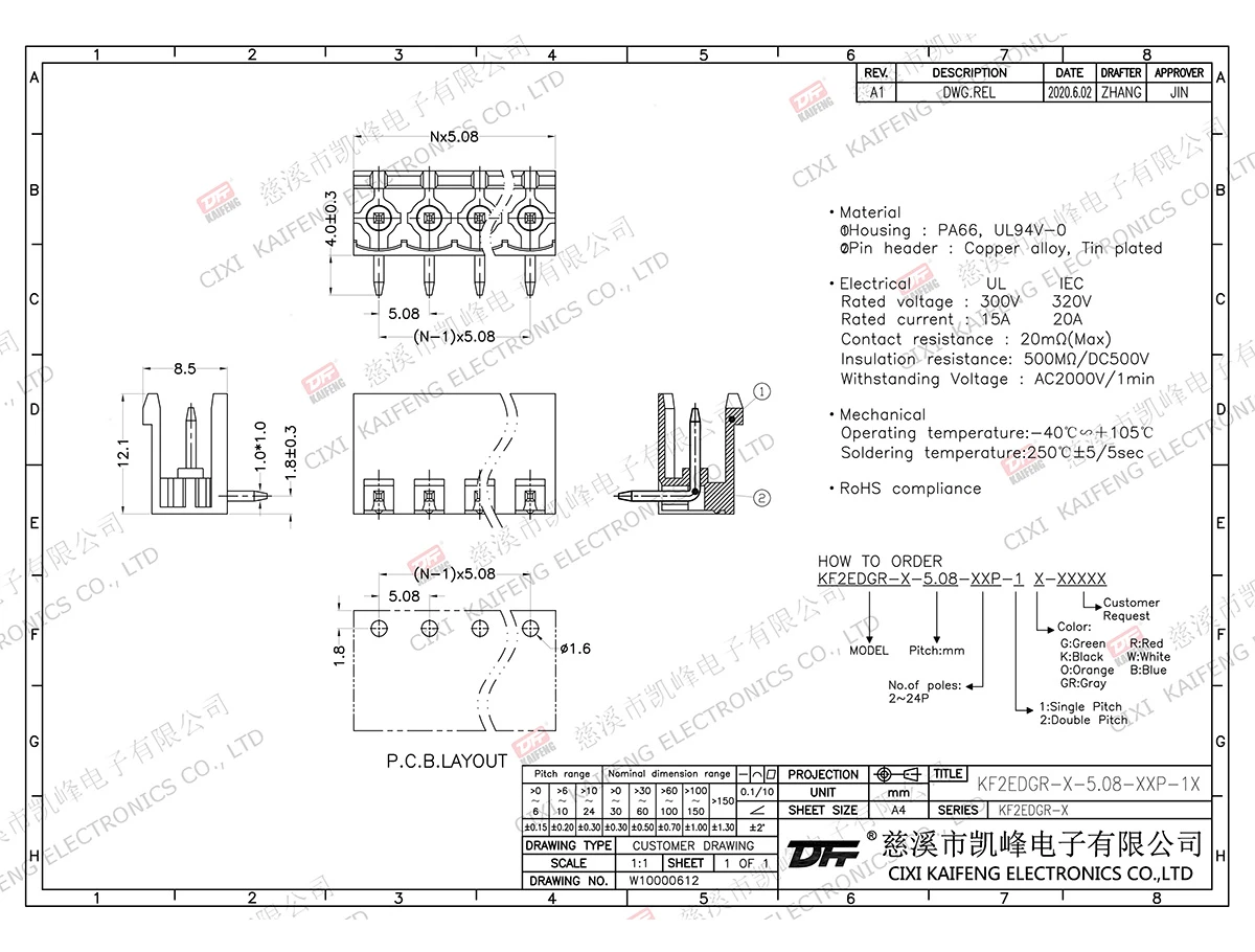 Pluggable Terminal Block MATERIAL:contact: -Pin header: Brass, Tin platedHousing: PA66,UL94V-0ElectricalULIECRated voltage300V 320V Rated current15A20AContact resistance20mΩInsulation resistance500MΩ/DC500VWithstanding voltage AC2000V/1minWire range-MechanicalTemp.rang-40℃~+105℃ Max.soldering+250℃,5secTorque-Strip length-