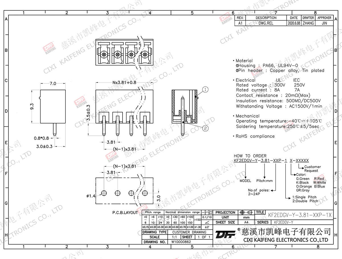 MATERIAL:contact: -Pin header: Brass, Tin platedHousing: PA66,UL94V-0ElectricalULIECRated voltage300V 250V Rated current8A7AContact resistance20mΩInsulation resistance500MΩ/DC500VWithstanding voltage AC1500V/1minWire range-MechanicalTemp.rang-40℃~+105℃ Max.soldering+250℃,5secTorque-Strip length-