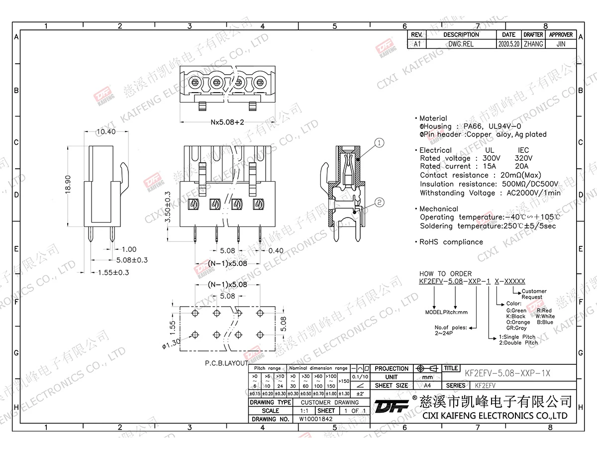 Pluggable Terminal Block MATERIAL:MATERIALScrews: -contact: -Pin header: Phosphor bronze,TinningHousing: PA66,UL94V-0ElectricalULIECRated voltage300V 320V Rated current15A20AContact resistance20mΩInsulation resistance500MΩ/DC500VWithstanding voltage AC2000V/1minWire range-MechanicalTemp.rang-40℃~+105℃ Max.soldering+250℃, 5secTorque-Strip length-