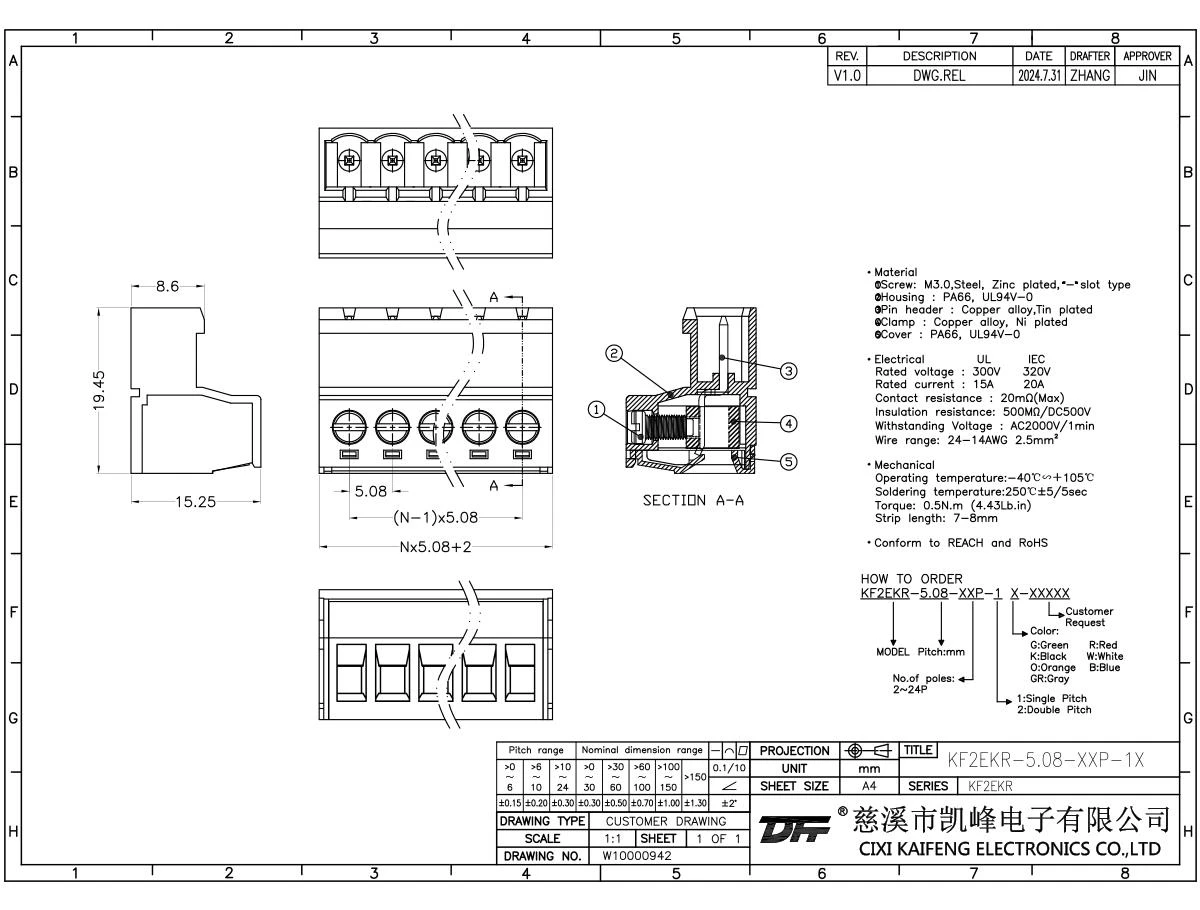 MATERIAL:MATERIALScrews: M3.0,Steel Zinc platedcontact: Phosphor bronzePin header: -Housing: PA66,UL94V-0ElectricalULIECRated voltage300V 320V Rated current15A20AContact resistance20mΩInsulation resistance500MΩ/DC500VWithstanding voltage AC2000V/1minWire range24-14AWG 2.5mm²MechanicalTemp.rang-40℃~+105℃ Max.soldering+25