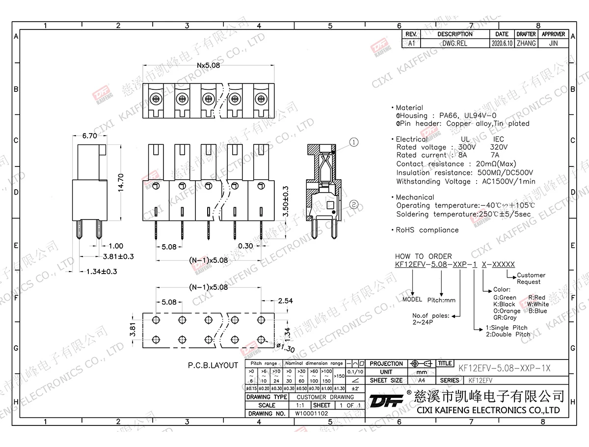 MATERIAL:contact: -Pin header: Phosphor bronze,TinningHousing: PA66,UL94V-0ElectricalULIECRated voltage300V 320V Rated current8A7AContact resistance20mΩInsulation resistance500MΩ/DC500VWithstanding voltage AC1500V/1minWire range-MechanicalTemp.rang-40℃~+105℃ Max.soldering+250℃, 5secTorque-Strip length-