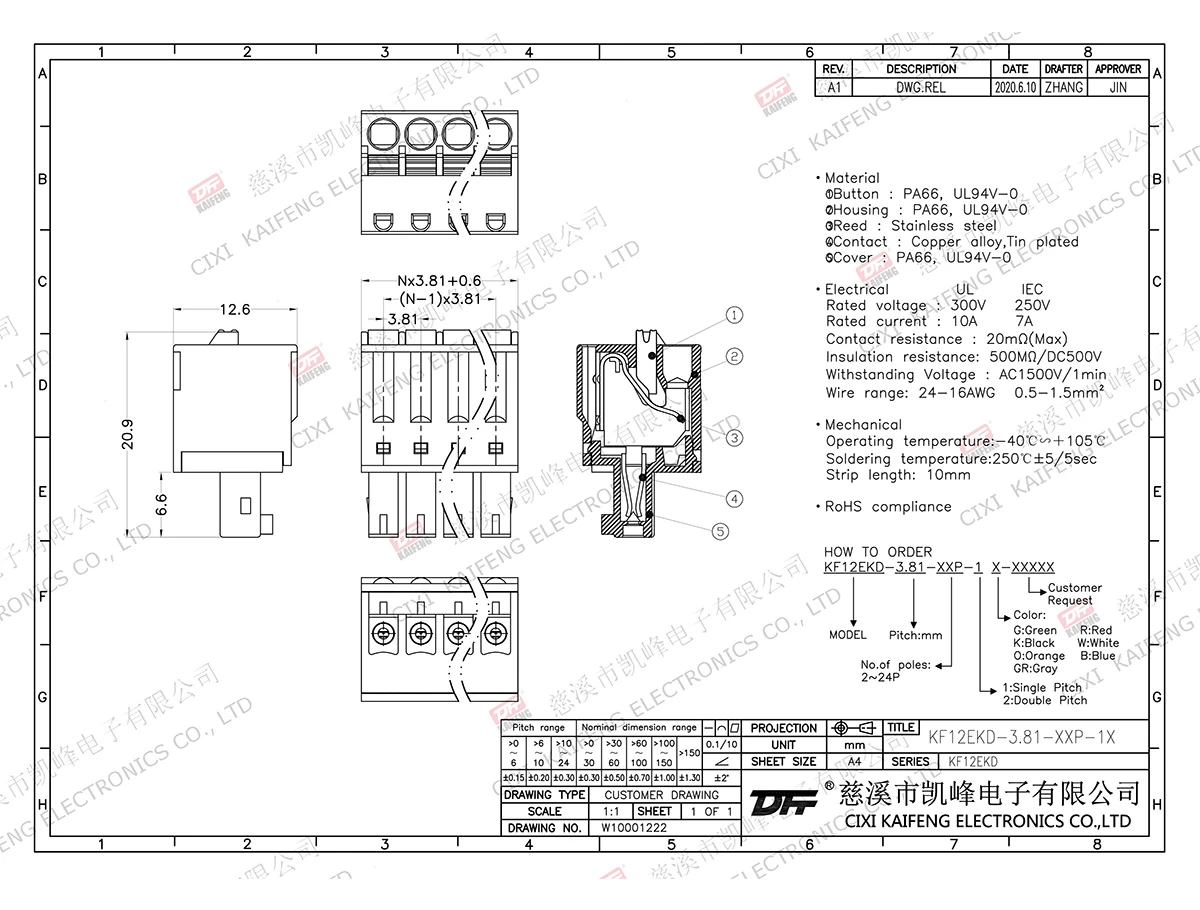 MATERIAL:contact: Phosphor bronzePin header: -Housing: PA66,UL94V-0ElectricalULIECRated voltage300V 250V Rated current10A7AContact resistance20mΩInsulation resistance500MΩ/DC500VWithstanding voltage AC1500V/1minWire range24-16AWG 0.5-1.5mm²MechanicalTemp.rang-40℃~+105℃ Max.soldering+250℃, 5secTorque-
