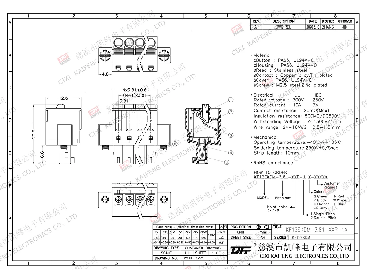 MATERIAL:-contact: Phosphor bronzePin header: -Housing: PA66,UL94V-0ElectricalULIECRated voltage300V 250V Rated current10A7AContact resistance20mΩInsulation resistance500MΩ/DC500VWithstanding voltage AC1500V/1minWire range24-16AWG 0.5-1.5mm²MechanicalTemp.rang-40℃~+105℃ Max.soldering+250℃, 5secTorque-