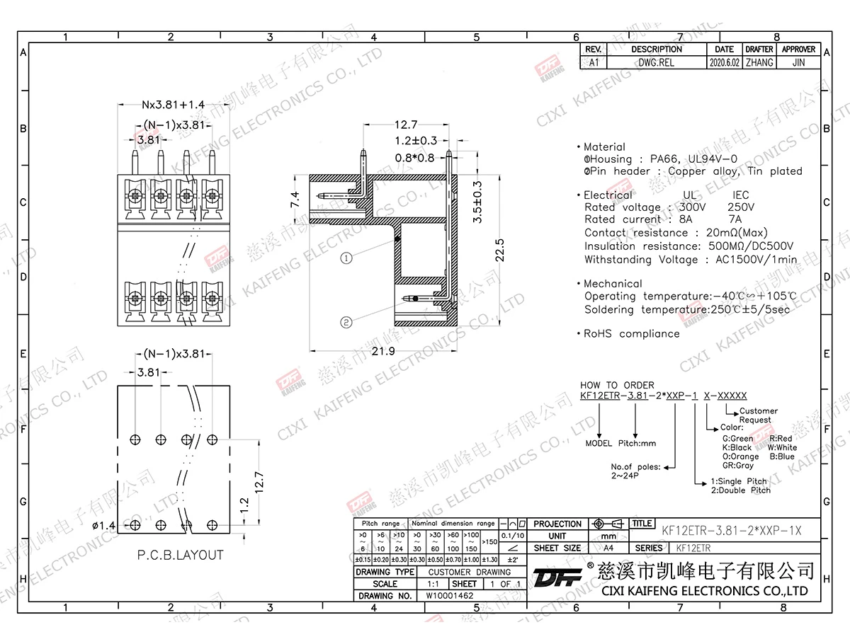 MATERIAL:contact: -Pin header: Brass, Tin platedHousing: PA66,UL94V-0ElectricalULIECRated voltage300V 250V Rated current8A7AContact resistance20mΩInsulation resistance500MΩ/DC500VWithstanding voltage AC1500V/1minWire range-MechanicalTemp.rang-40℃~+105℃ Max.soldering+250℃, 5secTorque-Strip length-