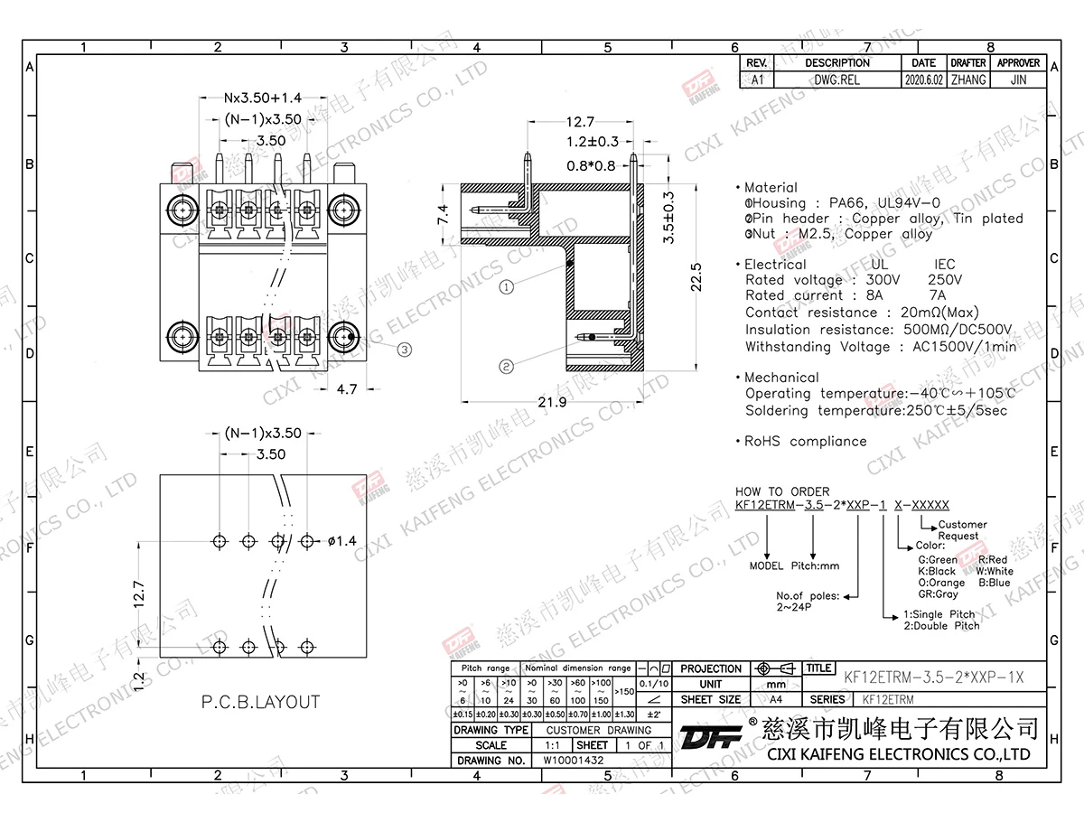 Pluggable Terminal Block MATERIAL:contact: -Pin header: Brass, Tin platedHousing: PA66,UL94V-0ElectricalULIECRated voltage300V 250V Rated current8A7AContact resistance20mΩInsulation resistance500MΩ/DC500VWithstanding voltage AC1500V/1minWire range-MechanicalTemp.rang-40℃~+105℃ Max.soldering+250℃, 5secTorque-Strip length-