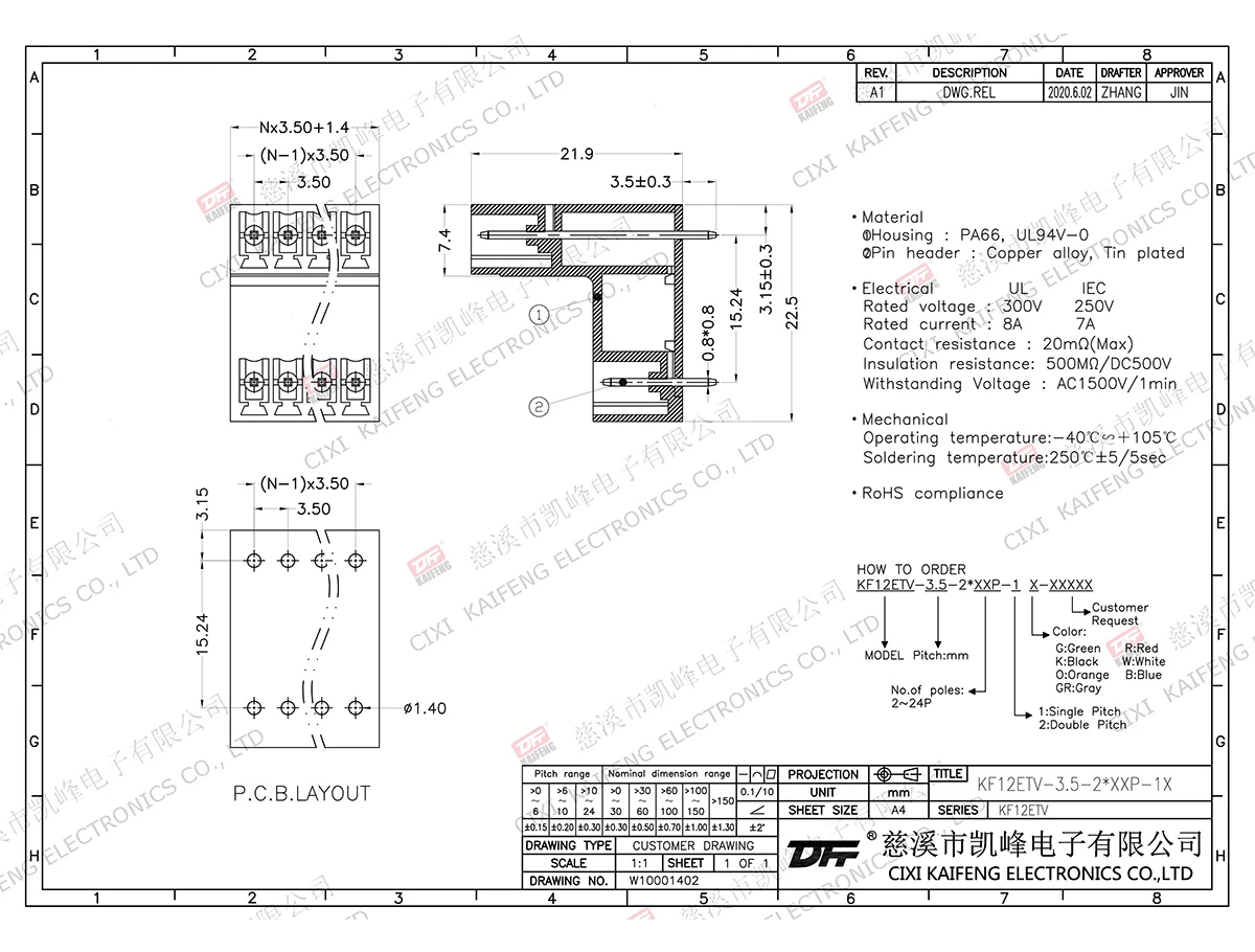 MATERIAL:contact: -Pin header: Brass, Tin platedHousing: PA66,UL94V-0ElectricalULIECRated voltage300V 250V Rated current8A7AContact resistance20mΩInsulation resistance500MΩ/DC500VWithstanding voltage AC1500V/1minWire range-MechanicalTemp.rang-40℃~+105℃ Max.soldering+250℃, 5secTorque-Strip length-