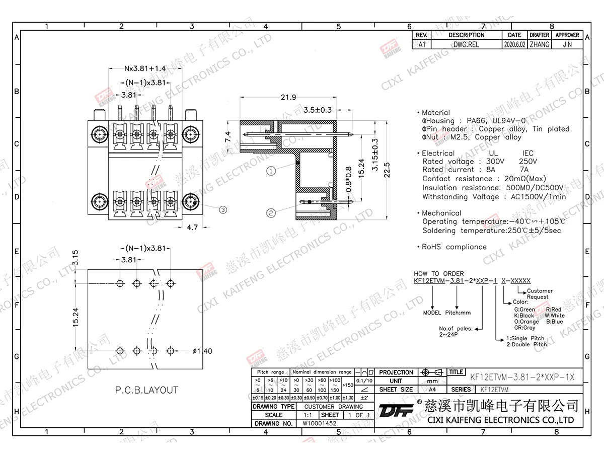 MATERIAL:contact: -Pin header: Brass, Tin platedHousing: PA66,UL94V-0ElectricalULIECRated voltage300V 250V Rated current8A7AContact resistance20mΩInsulation resistance500MΩ/DC500VWithstanding voltage AC1500V/1minWire range-MechanicalTemp.rang-40℃~+105℃ Max.soldering+250℃, 5secTorque-Strip length-