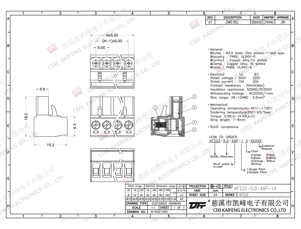 MATERIAL:MATERIALScrews: M2.5,Steel Zinc platedcontact: Phosphor bronzePin header: -Housing: PA66,UL94V-0ElectricalULIECRated voltage300V 320V Rated current15A20AContact resistance20mΩInsulation resistance500MΩ/DC500VWithstanding voltage AC2000V/1minWire range28-12AWG 2.5mm²MechanicalTemp.rang-40℃~+105℃ Max.soldering+250℃, 5s