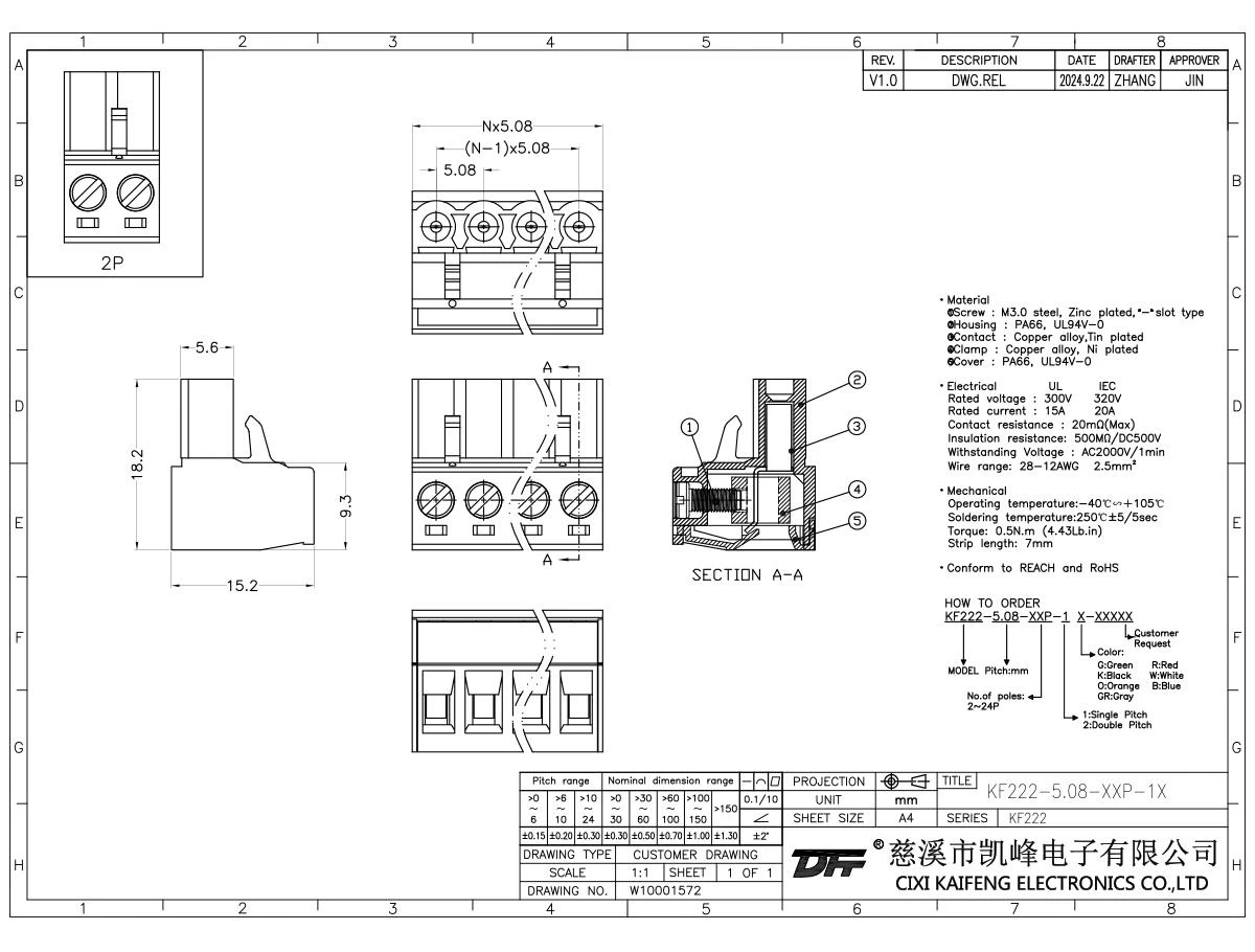 MATERIAL:MATERIALScrews: M2.5,Steel Zinc platedcontact: Phosphor bronzePin header: -Housing: PA66,UL94V-0ElectricalULIECRated voltage300V 320V Rated current15A20AContact resistance20mΩInsulation resistance500MΩ/DC500VWithstanding voltage AC2000V/1minWire range28-12AWG 2.5mm²MechanicalTemp.rang-40℃~+105℃ Max.soldering+250℃, 5s