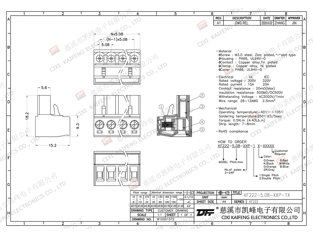 MATERIAL:MATERIALScrews: M2.5,Steel Zinc platedcontact: Phosphor bronzePin header: -Housing: PA66,UL94V-0ElectricalULIECRated voltage300V 320V Rated current15A20AContact resistance20mΩInsulation resistance500MΩ/DC500VWithstanding voltage AC2000V/1minWire range28-12AWG 2.5mm²MechanicalTemp.rang-40℃~+105℃ Max.soldering+250℃, 5s