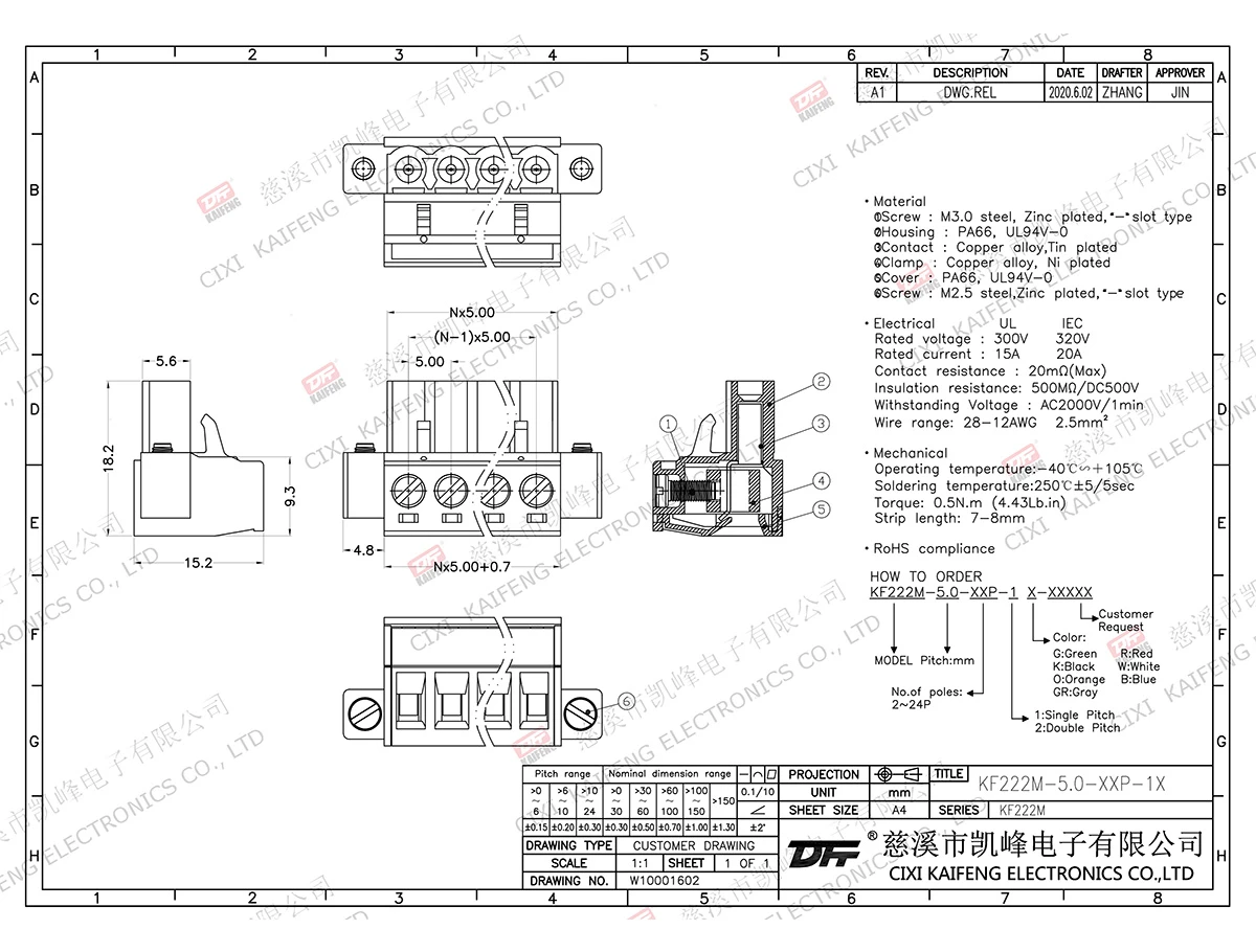 Pluggable Terminal Block MATERIAL:M2.5,Steel Zinc platedcontact:Phosphor bronzePin header:-Housing:PA66,UL94V-0ElectricalULIECRated voltage300V320VRated current15A10AContact resistance20mΩInsulation resistance500MΩ/DC500VWithstanding voltage AC2000V/1minWire range28-12AWG2.5mm²MechanicalTemp.rang-40℃~+105℃Max.soldering+250℃,5secTorque0.4N.m3.5Lb.inStrip length7-8mm