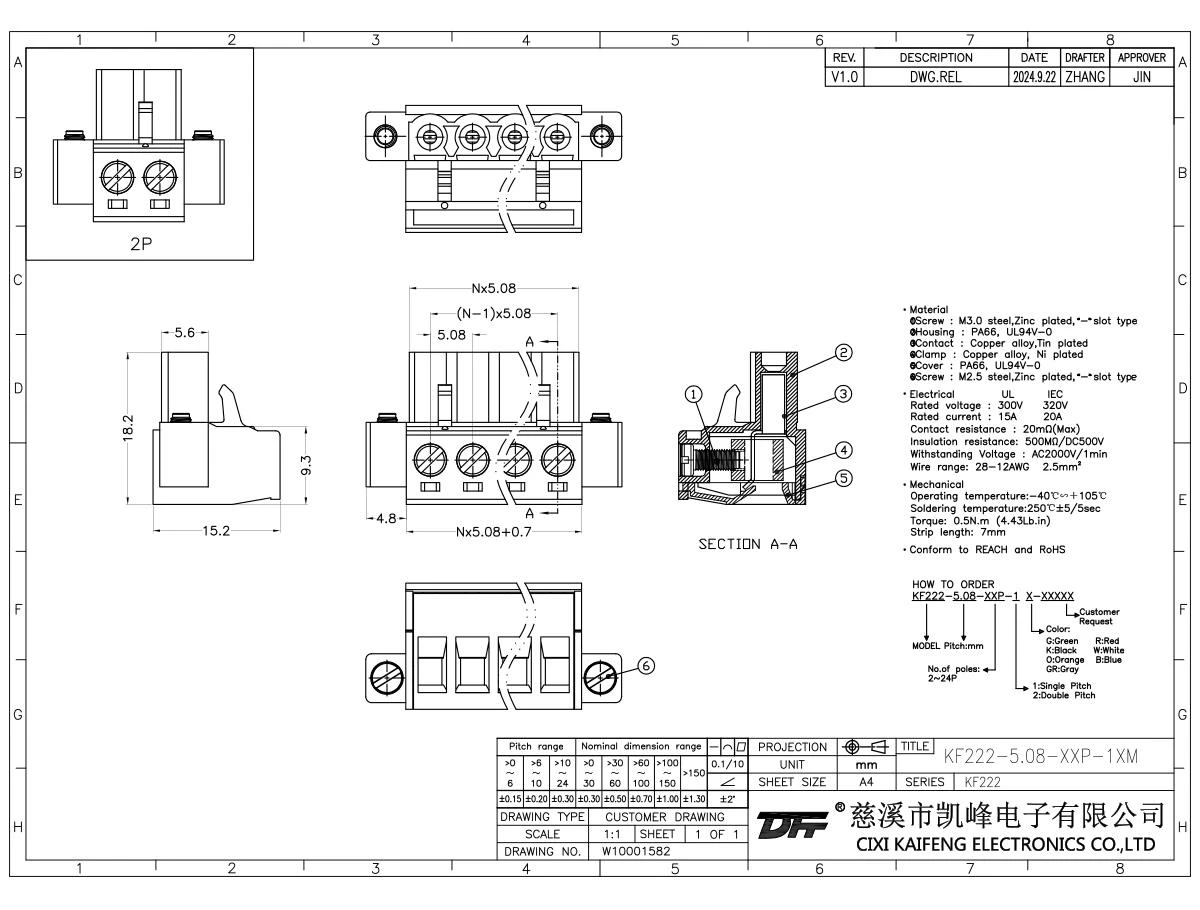 MATERIAL:M2.5,Steel Zinc platedcontact:Phosphor bronzePin header:-Housing:PA66,UL94V-0ElectricalULIECRated voltage300V320VRated current15A10AContact resistance20mΩInsulation resistance500MΩ/DC500VWithstanding voltage AC2000V/1minWire range28-12AWG2.5mm²MechanicalTemp.rang-40℃~+105℃Max.soldering+250℃,5secTorque0.4N.m3.5Lb.inStrip length7-8mm