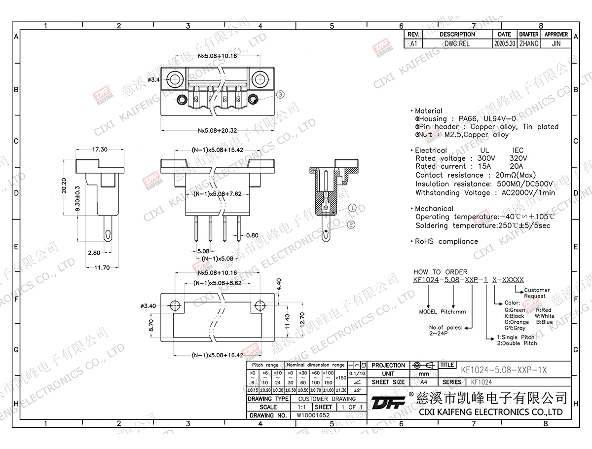 MATERIAL:MATERIALScrews: -contact: -Pin header: Brass, Tin platedHousing: PA66,UL94V-0ElectricalULIECRated voltage300V 320V Rated current15A20AContact resistance20mΩInsulation resistance500MΩ/DC500VWithstanding voltage AC2000V/1minWire range-MechanicalTemp.rang-40℃~+105℃ Max.soldering+250℃, 5secTorque-Strip length-