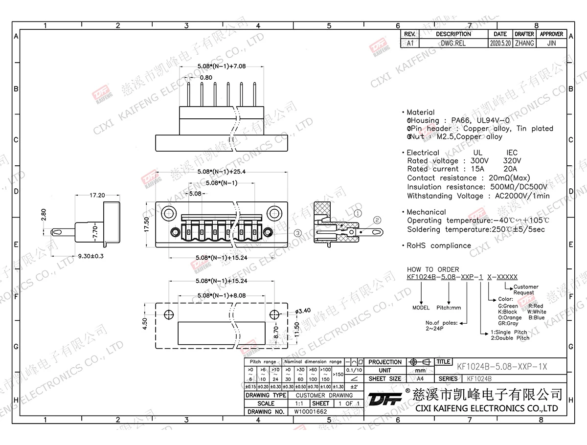 MATERIAL:-Brasscontact: -Pin header: Brass, Tin platedHousing: PA66,UL94V-0ElectricalULIECRated voltage300V 320V Rated current15A20AContact resistance20mΩInsulation resistance500MΩ/DC500VWithstanding voltage AC2000V/1minWire range-MechanicalTemp.rang-40℃~+105℃ Max.soldering+250℃, 5secTorque-Strip length-