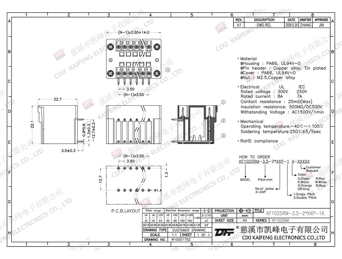 MATERIAL:contact: -Pin header: Brass, Tin platedHousing: PA66,UL94V-0ElectricalULIECRated voltage300V 250V Rated current8A7AContact resistance20mΩInsulation resistance500MΩ/DC500VWithstanding voltage AC1500V/1minWire range-MechanicalTemp.rang-40℃~+105℃ Max.soldering+250℃, 5secTorque-Strip length-