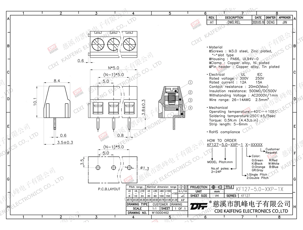 PCB Terminal Block MATERIAL:M2.5steel,Ni platedContact material:BrassNi platedPin header:Brass, Tin platedHousing:PA66,UL94V-0·ELECTRICALRated voltage:300VRated current:10AContact resistance:20mΩInsulation resistance:5000MΩ\1000VWithstanding voltage :AC2000V\1MinWire range:26-14AWG1.5mm²·MechanicalTemp.rang:-40℃~+105℃Max.soldering:+250℃5S torque:0.5Nm(4.5lb.in)Strip length:5-6mm