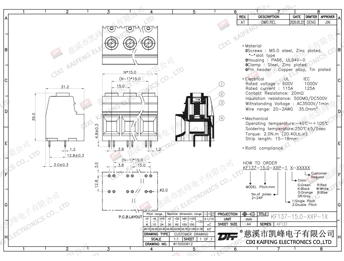 MATERIAL:Screws:M5steel,Ni plated材料:Brass, Tin platedPin header:Brass, Tin platedHousing:PA66UL94V-0·ELECTRICALRated voltage:600VRated current:90AContact resistance:20m?Insulation resistance:5000M?\1000VWithstanding voltage :AC300V\1MinWire range:22-2AWG25mm2·MechanicalTemp.rang:-40℃∽+105℃Max.soldering:+250 ℃ / 5S torque:2Nm(17.54lb.in)Strip length:15-18mm