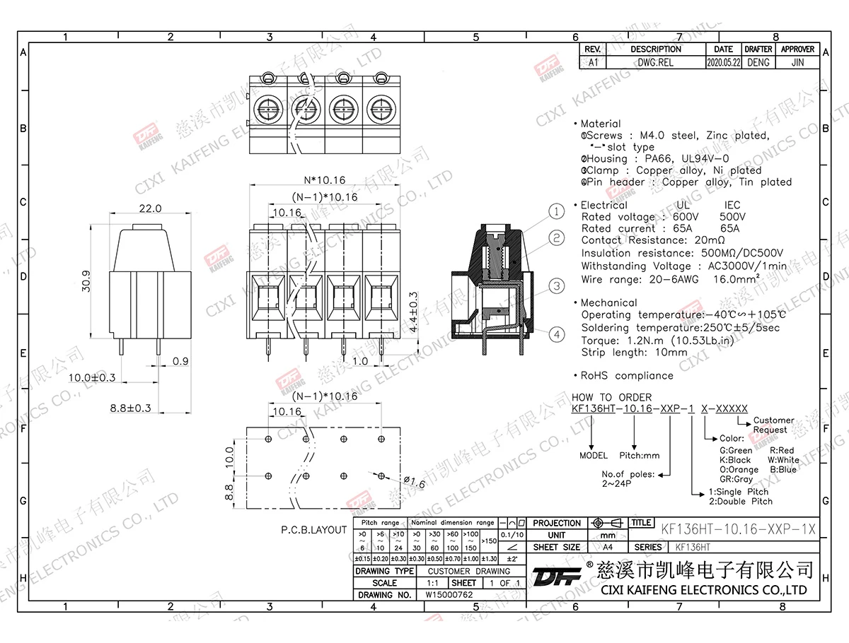 MATERIAL:MATERIAL①Screws:M4.0Steel Zinc plated,"-"slot type②Housing:PA66,UL94V-0③square box:Red copper,Ni plated④Pin header:Brass, Tin platedELECTRICALULIECRated voltage600V1000VRated current65A65AContact resistance20mΩ(Max)Insulation resistance500MΩ\DC500VWithstanding voltage AC3000V\1MinWire range20-6AWG16.0mm²MechanicalTemp.rang-40℃~+105℃Max.soldering+250℃,5secTorque1.2