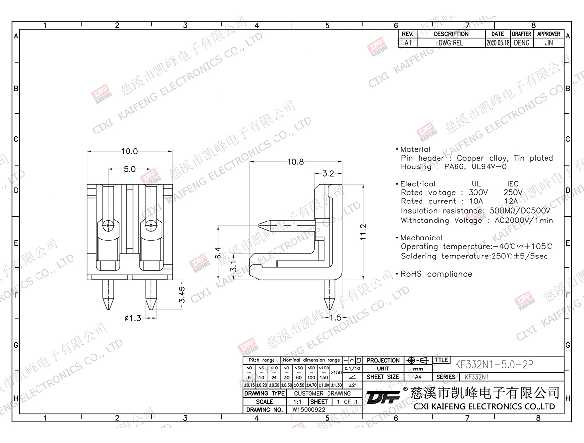 PCB Terminal Block MATERIAL:MATERIALPin header:Brass, Tin platedHousing:PA66,UL94V-0ELECTRICALULIECRated voltage300V250VRated current10A12AContact resistance20mΩ(Max)Insulation resistance500MΩ\DC500VWithstanding voltage AC2000V\1MinMechanicalTemp.rang-40℃~+105℃Max.soldering+250℃,5sec