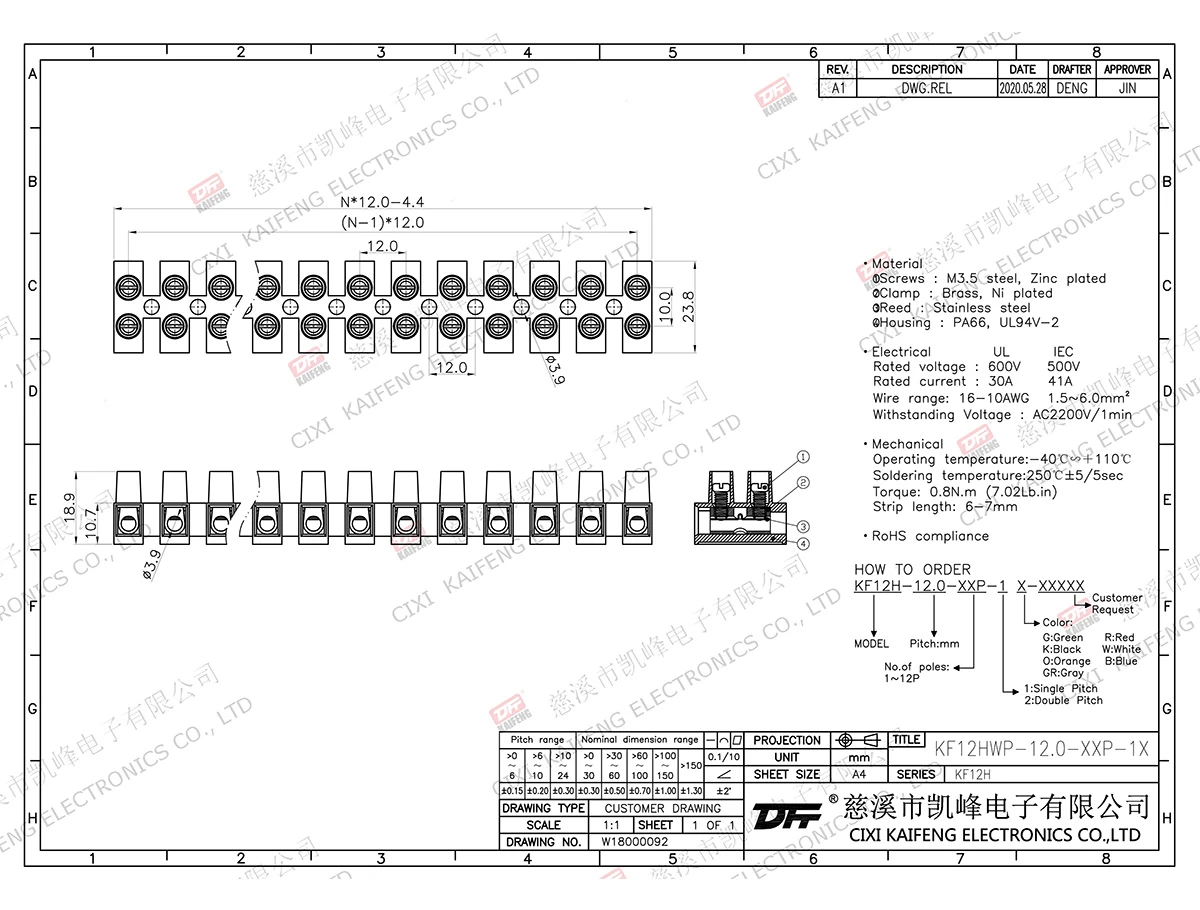 MATERIAL:①Screws:M3.5,Steel Zinc plated②block:Brass, Tin plated③Reed:Stainless steel④Housing:Nylon PA66(UL94V-2)ELECTRICALULIECRated voltage600V 500V Rated current30A41AELECTRICAL16-10AWG 1.5-6.0mm²MechanicalTemp.rang-40℃~+110℃ Max.soldering+250℃ 5 secondsProduct numberKF12HWP-XPBasehighH XPNo.