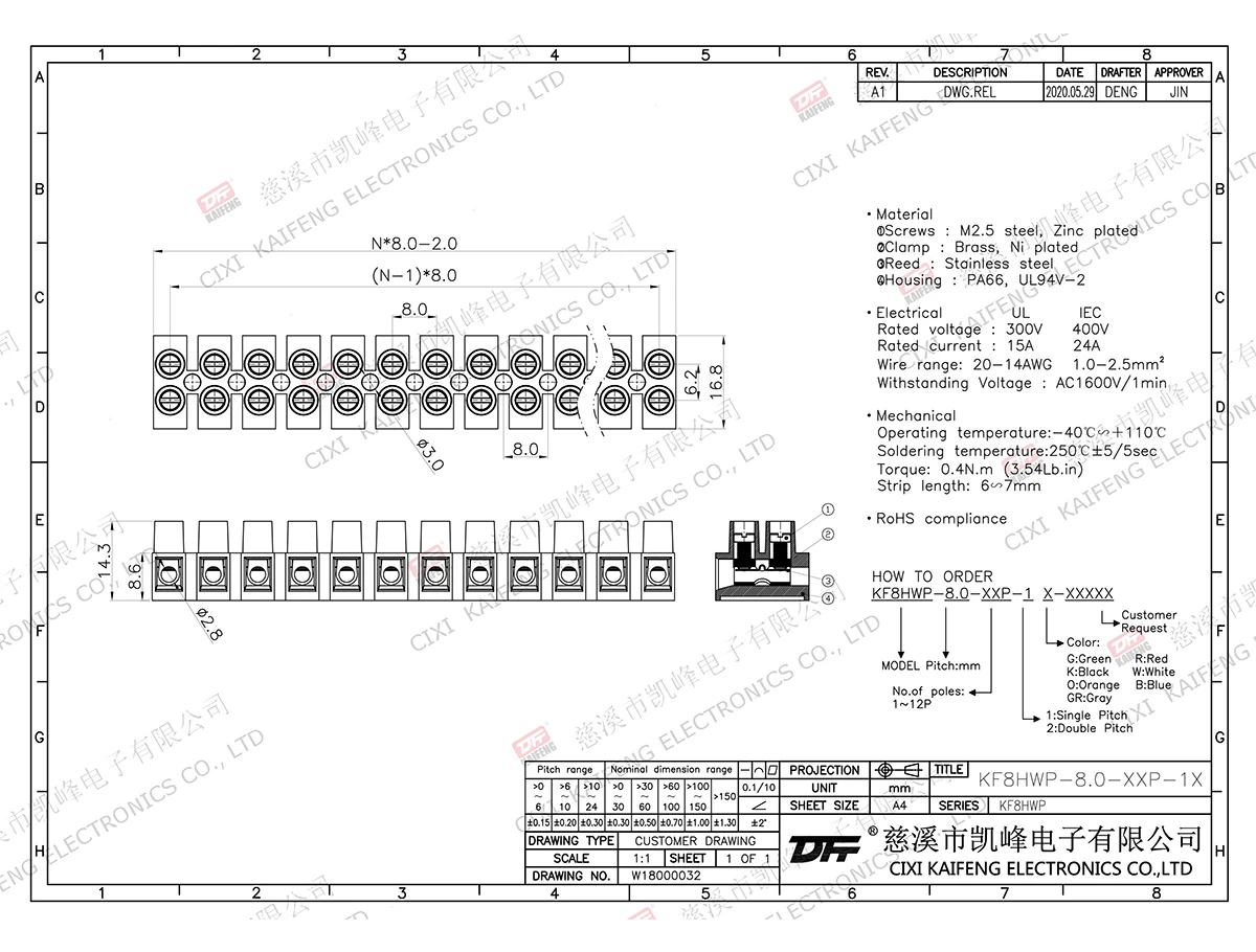 MATERIAL:①Screws:M2.5,Steel Zinc plated②block:Brass, Tin plated③Reed:Stainless steel④Housing:Nylon PA66(UL94V-2)ELECTRICALULIECRated voltage300V 400V Rated current15A24AELECTRICAL20-14AWG 1.0-2.5mm²MechanicalTemp.rang-40℃~+110℃ Max.soldering+250℃ 5 secondsProduct numberKF8HWP-XPBasehighH XPNo.o