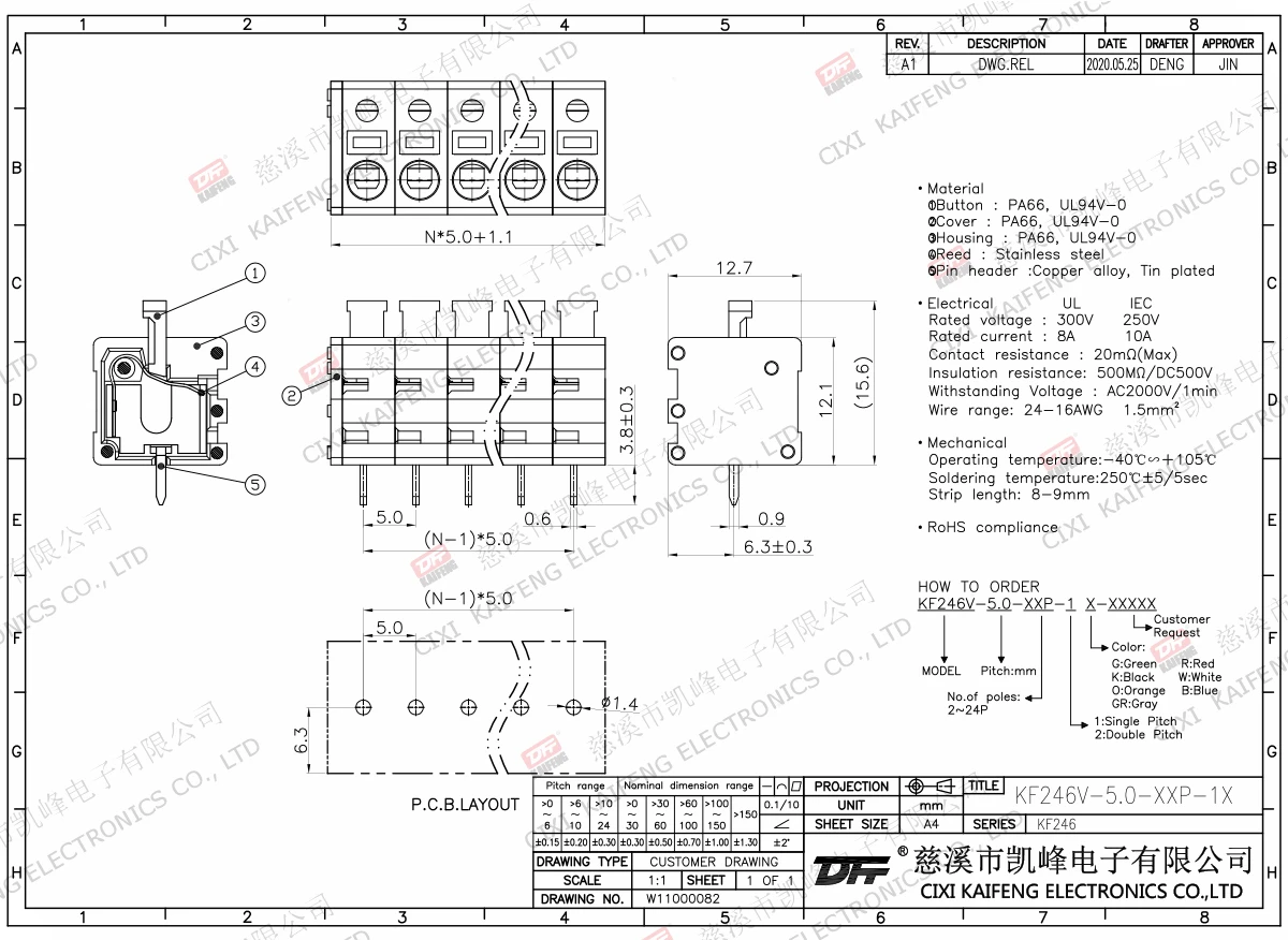 Terminal Material:①Button:PA66,UL94V-0②Cover:PA66,UL94V-0③Button:PA66,UL94V-0④Reed:Stainless steel⑤Pin header:Brass,Tin platedElectricalULIECRated voltage300V 250V Rated current8A10AContact resistance20mΩInsulation resistance500MΩ/DC500VWithstanding voltage AC2000V/1minWire range24-16AWG 1.5mm²MechanlicalTemp.rang-40℃~+105℃