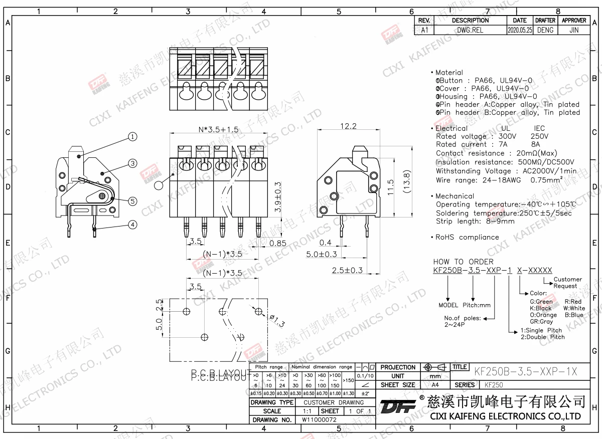 Terminal Material:①Button:PA66,UL94V-0②Cover:PA66,UL94V-0③Button:PA66,UL94V-0④Pin headerA:Brass,Tin plated⑤Pin headerB:Brass,Tin platedElectricalULIECRated voltage300V 450V Rated current7A9AContact resistance20mΩInsulation resistance500MΩ/DC500VWithstanding voltage AC2000V/1minWire range24-18AWG 0.75mm²MechanlicalTemp.rang-40℃~+105℃