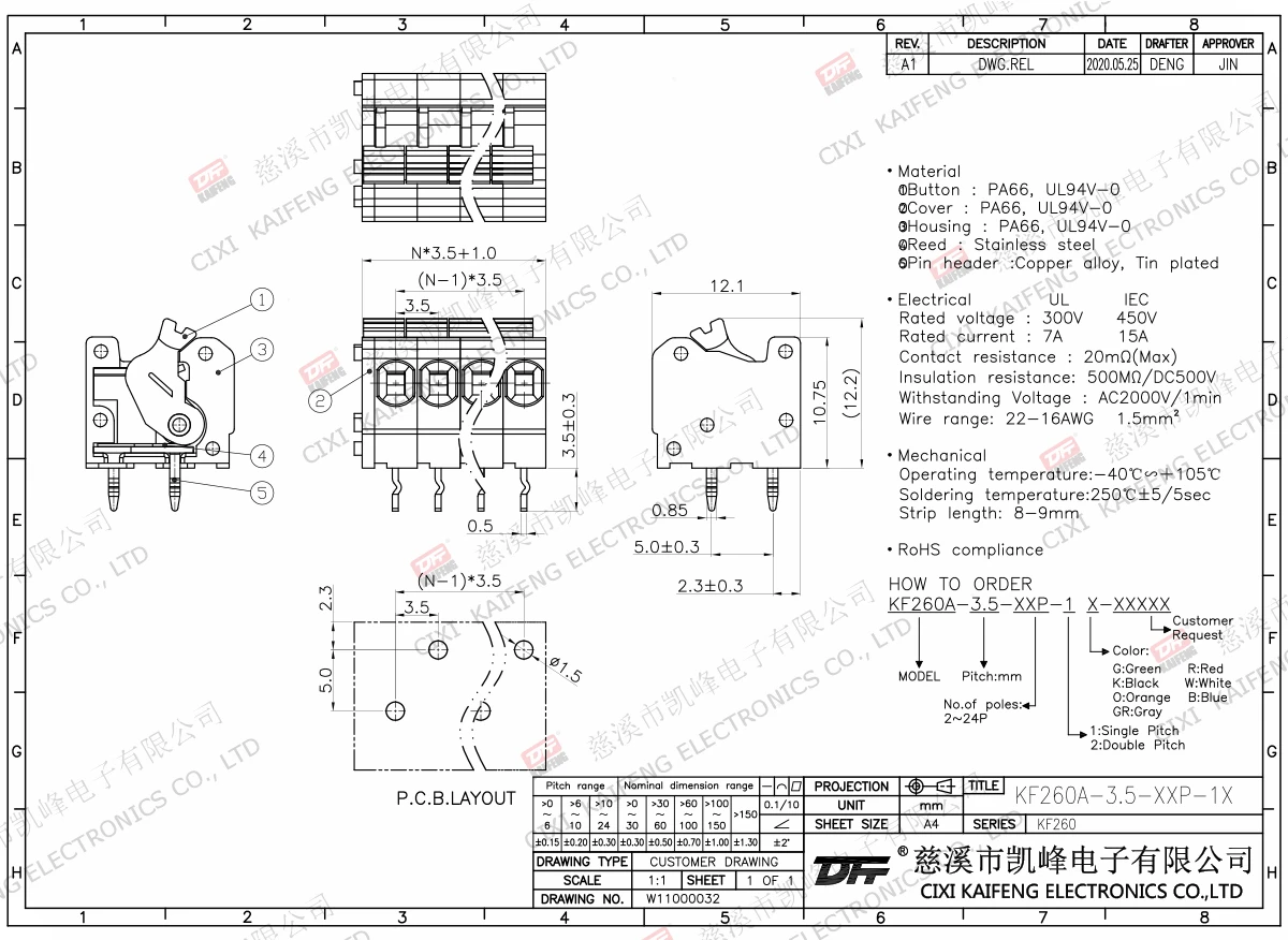 Terminal Material:①Button:PA66,UL94V-0②Cover:PA66,UL94V-0③Button:PA66,UL94V-0④Reed:Stainless steel⑤Pin header:Brass,Tin platedElectricalULIECRated voltage300V 450V Rated current7A15AContact resistance20mΩInsulation resistance500MΩ/DC500VWithstanding voltage AC2000V/1minWire range22-16AWG 1.5mm²MechanlicalTemp.rang-40℃~+105℃ Max.soldering+2