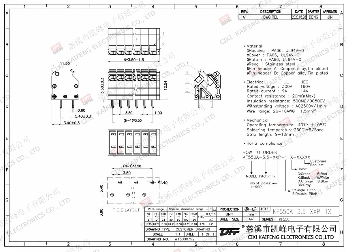 Terminal Material:①Housing:PA66,UL94V-0②Cover:PA66,UL94V-0③Cover:PA66,UL94V-0④Button:PA66,UL94V-0⑤Reed:Stainless steel⑥Long welding leg:Red copper,Tin plated⑦Short welding leg:Red copper,Tin platedElectricalULIECRated voltage300V 320V Rated current10A17.5AContact resistance20mΩInsulation resistance500MΩ/DC500VWithstanding voltage AC2000V/1minWire range26-16AWG 1.5mm²