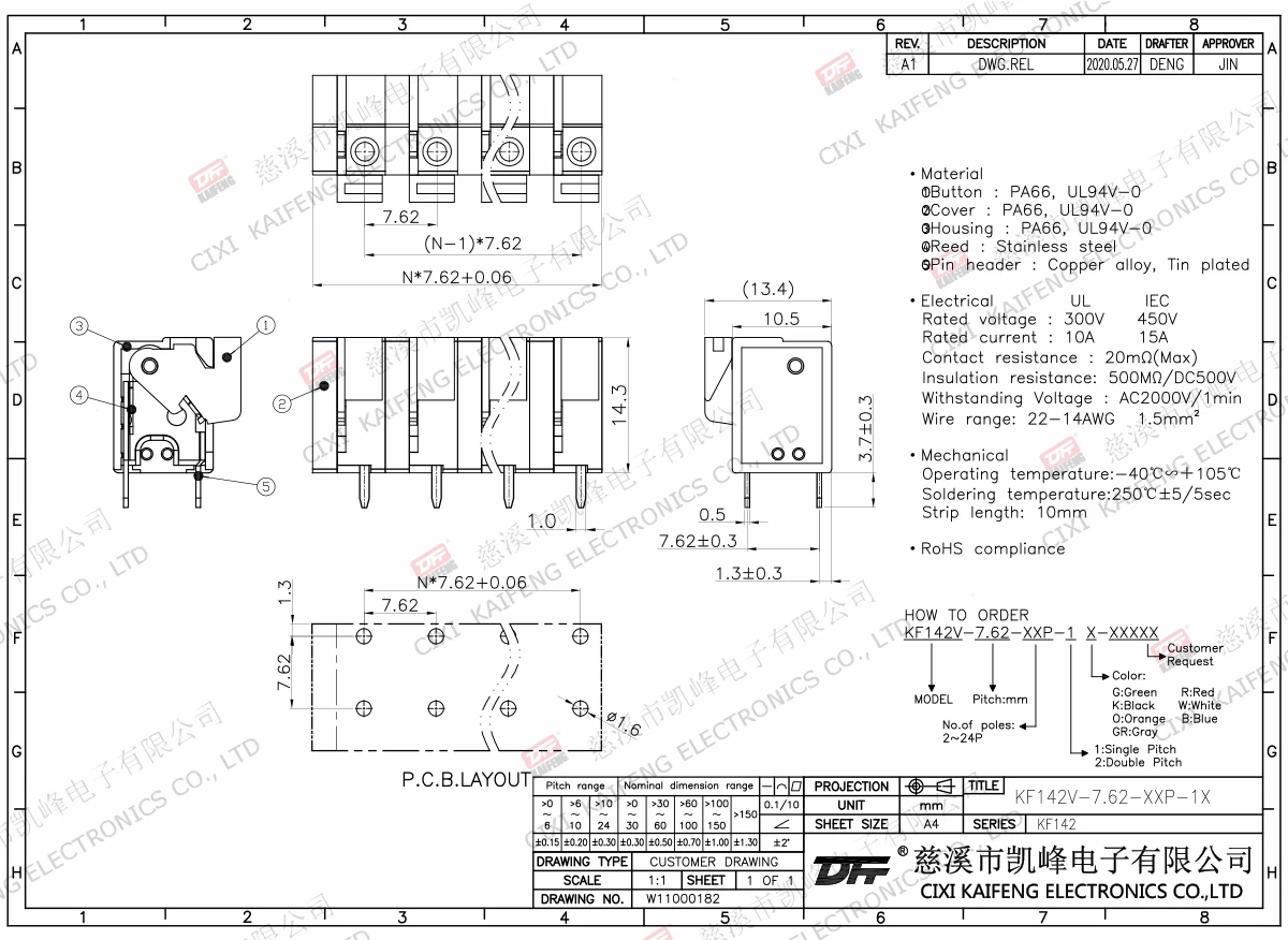 Material:①Button:PA66,UL94V-0②Cover:PA66,UL94V-0③Button:PA66,UL94V-0④Reed:Stainless steel⑤Pin header:Brass,Tin platedElectricalULIECRated voltage300V 250V Rated current10A15AContact resistance20mΩInsulation resistance500MΩ/DC500VWithstanding voltage AC2000V/1minWire range22-14AWG 1.5mm²MechanlicalTemp.rang-40℃~+105℃ Max.soldering+250℃,5sec