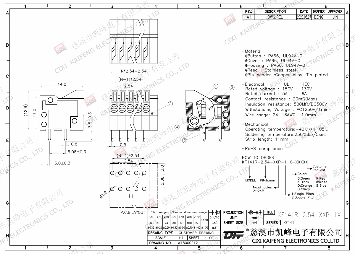 Material:①Button:PA66,UL94V-0②Cover:PA66,UL94V-0③Button:PA66,UL94V-0④Reed:Stainless steel⑤Pin header:Brass,Tin platedElectricalULIECRated voltage150V 130V Rated current5A6AContact resistance20mΩInsulation resistance500MΩ/DC500VWithstanding voltage AC1250V/1minWire range24-18AWG 1.0mm²MechanlicalTemp.rang-40℃~+105℃ Max.soldering+250℃,5sec