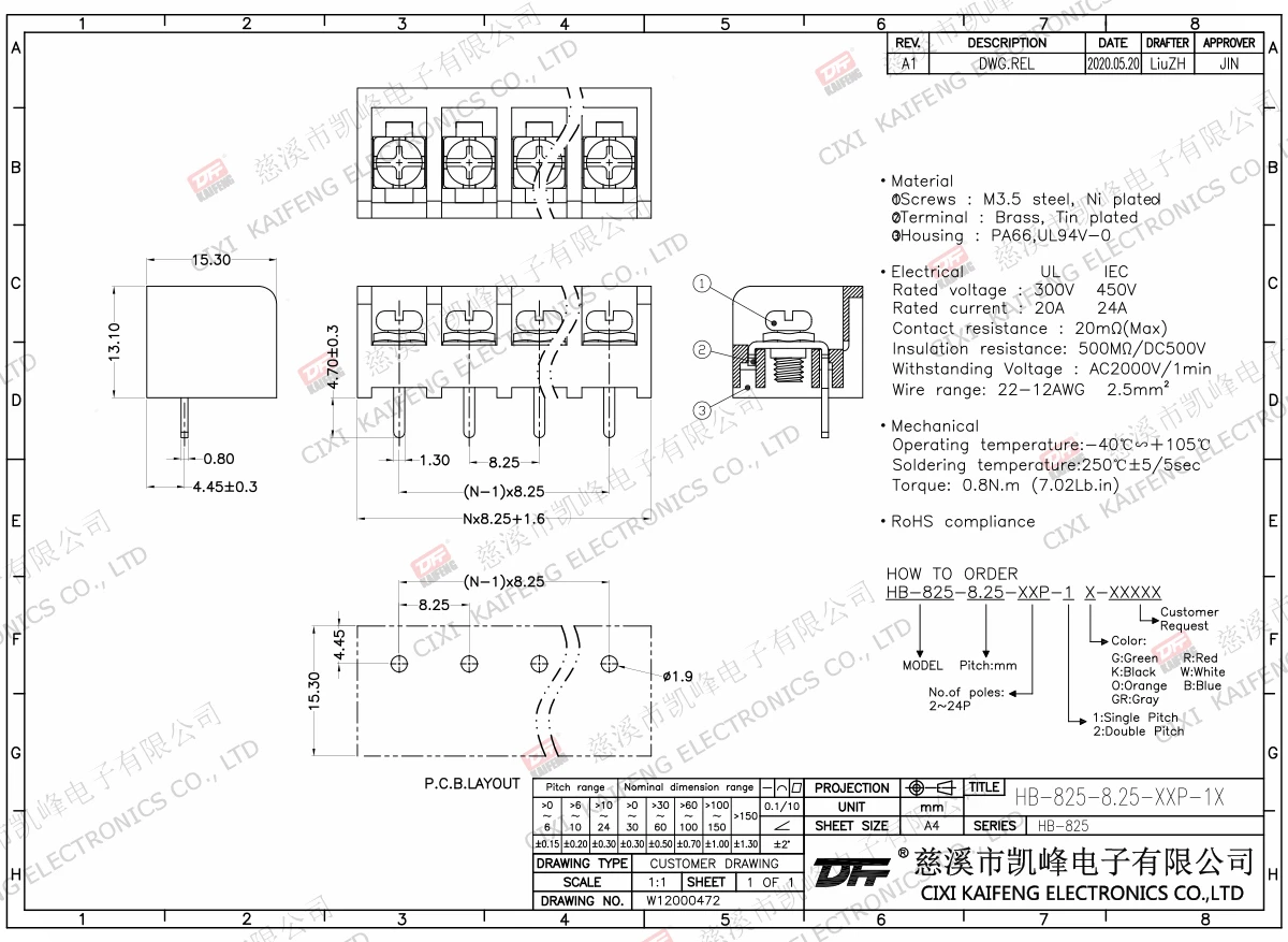 Material:M3.5 Steel,Ni platedTerminal:Brass,0.7t Ni platedHousing: PA66,UL94V-0ElectricalULIECRated voltage300V 450V Rated current20A24AInsulation resistance500MΩ/DC500VWithstanding voltage AC2000V/1minWire range22-12AWG 2.5mm²MechanlicalTemp.rang-40℃~+105℃ Torque0.8N.m 7.02Lb.in