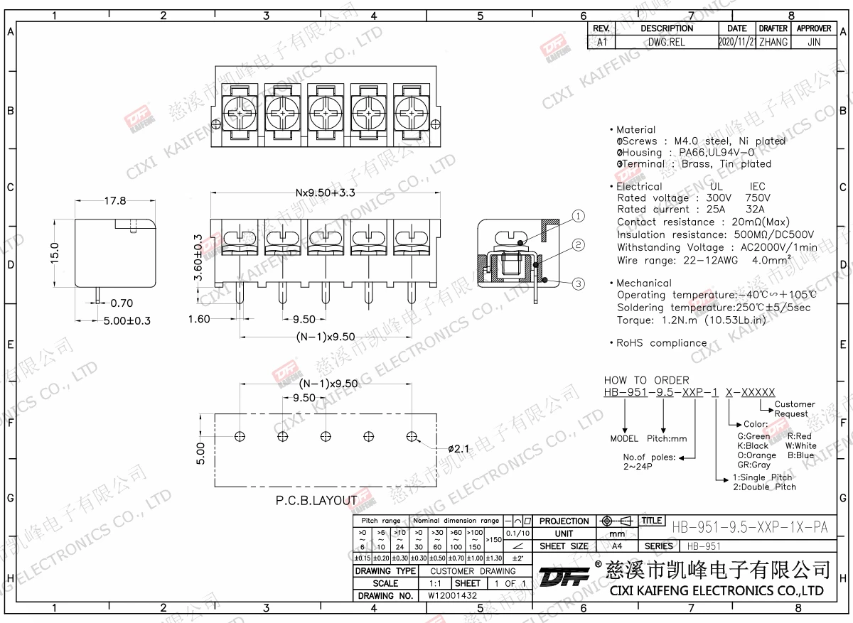 Material:Screws(Screw):M3.0,Steel,Ni platedSteel,NiPlatedTerminal(Pinheader):Brass,0.8tTin platedBrass,TinplatedHousing(Housing):PA66,UL94V-0·Electrical(Electrical)Rated voltage(RatedVoltage):300VRated current(RatedCurrent):20AInsulation resistance