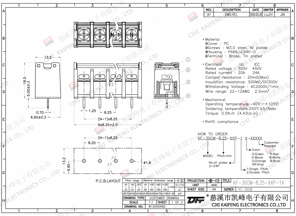 Material:M3.0 Steel,Ni platedTerminal:Brass,0.7t Ni platedHousing: PA66,UL94V-0ElectricalULIECRated voltage300V 450V Rated current20A24AInsulation resistance500MΩ/DC500VWithstanding voltage AC2000V/1minWire range22-12AWG 2.5mm²MechanlicalTemp.rang-40℃~+105℃ Torque0.5N.m 4.4Lb.in