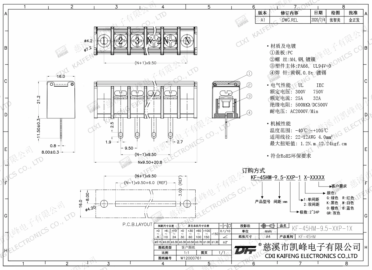 Material:M4.0 Steel,Ni platedTerminal:Brass,0.8t Ni platedHousing: PA66,UL94V-0ElectricalULIECRated voltage300V 750V Rated current25A32AInsulation resistance500MΩ/DC500VWithstanding voltage AC2000V/1minWire range22-12AWG 4.0mm²MechanlicalTemp.rang-40℃~+105℃ Torque1.2N.m 10.53Lb.in