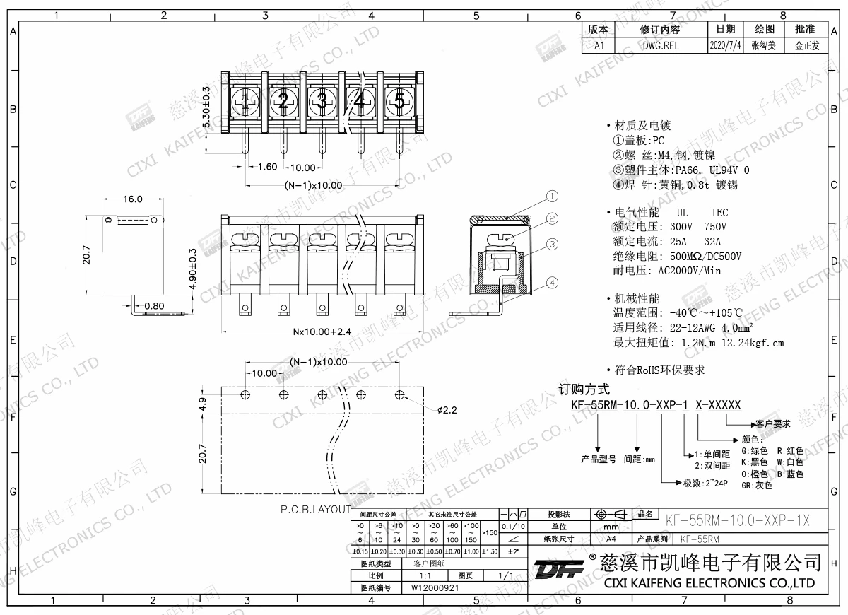 Material:M4.0 Steel,Ni platedTerminal:Brass,0.8t Ni platedHousing: PA66,UL94V-0ElectricalULIECRated voltage300V 750V Rated current25A32AInsulation resistance500MΩ/DC500VWithstanding voltage AC2000V/1minWire range22-12AWG 4.0mm²MechanlicalTemp.rang-40℃~+105℃ Torque1.2N.m 10.53Lb.in