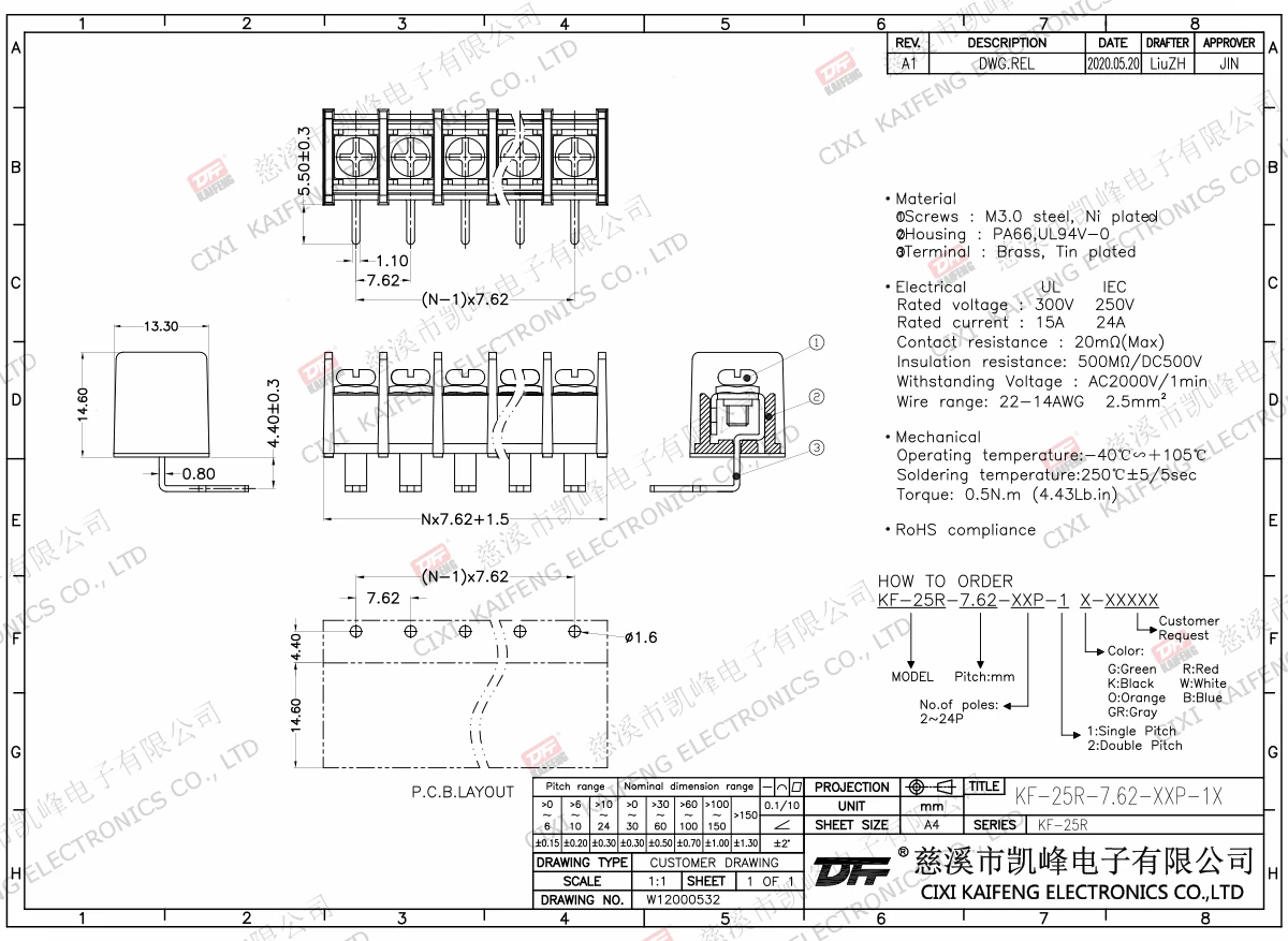 Material:M3.0 Steel,Ni platedTerminal:Brass,0.8t Ni platedHousing: PA66,UL94V-0ElectricalULIECRated voltage300V 250V Rated current15A24AInsulation resistance500MΩ/DC500VWithstanding voltage AC2000V/1minWire range22-14AWG 2.5mm²MechanlicalTemp.rang-40℃~+105℃ Torque0.5N.m 4.4Lb.in