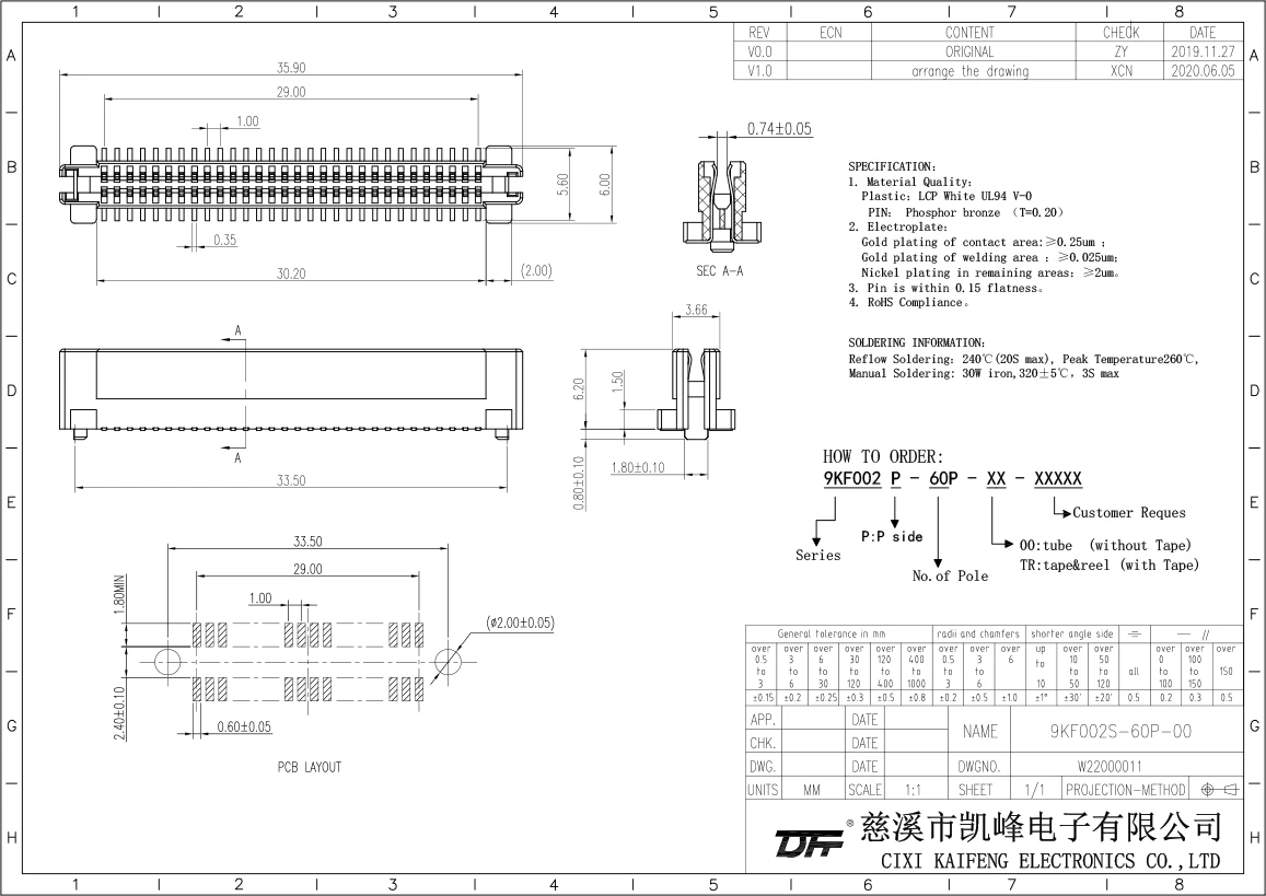 Material:SPECIFICATIONMaterial QualityPlasticLCP White UL94V-0PINPhosphor bronze (t=0.20) ElectroplateGold plating of welding area : ≥0.25umGold plating of welding area : ≥0.02