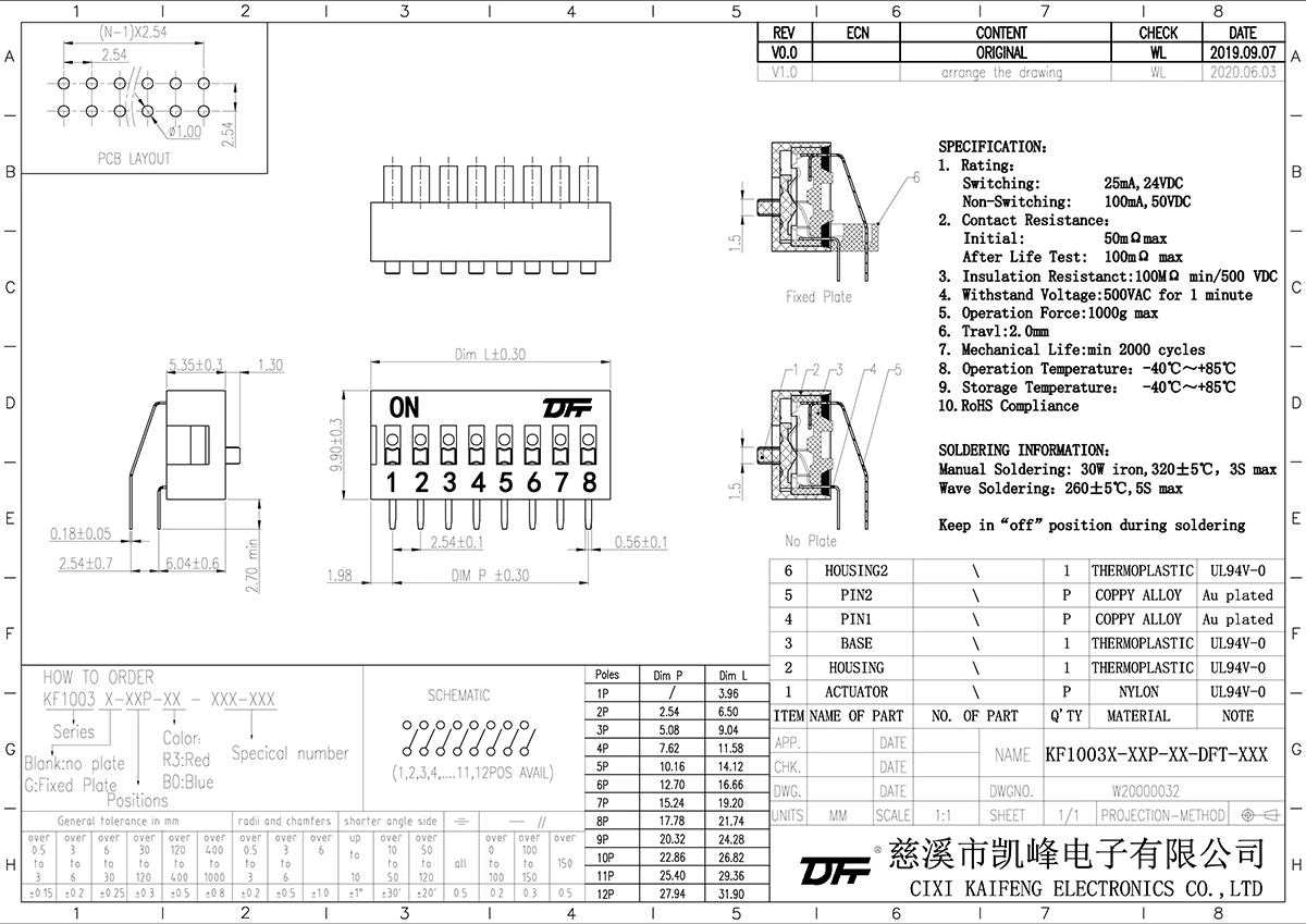 :UL94V-0 Thermoplaslic,WhiteTerminal:Phosphor Bronze,Gold plating ElectricalElectrical life:2000 operations per switch 24VDC,25mARated current:100mA