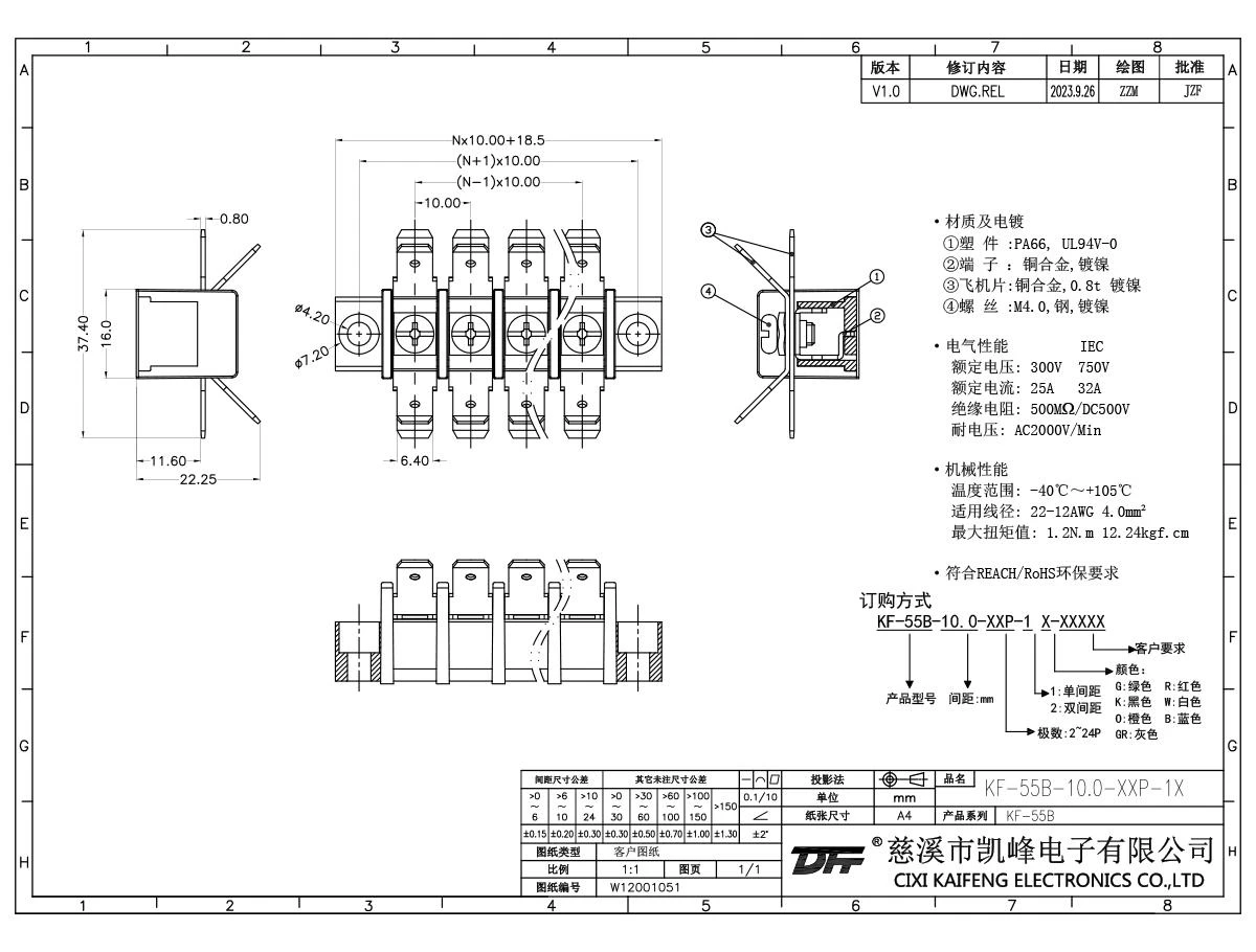 材质电镀:M4.0 钢,镀镍端子:黄铜,0.8t 镀镍塑件: PA66,UL94V-0电气性能ULIEC额定电压300V 750V 额定电流25A32A绝缘电阻500MΩ/DC500V耐电压AC2000V/1min使用线径22-12AWG 4.0mm²机械性能温度范围-40℃~+105℃ 扭矩1.2N.m 10.53Lb.in