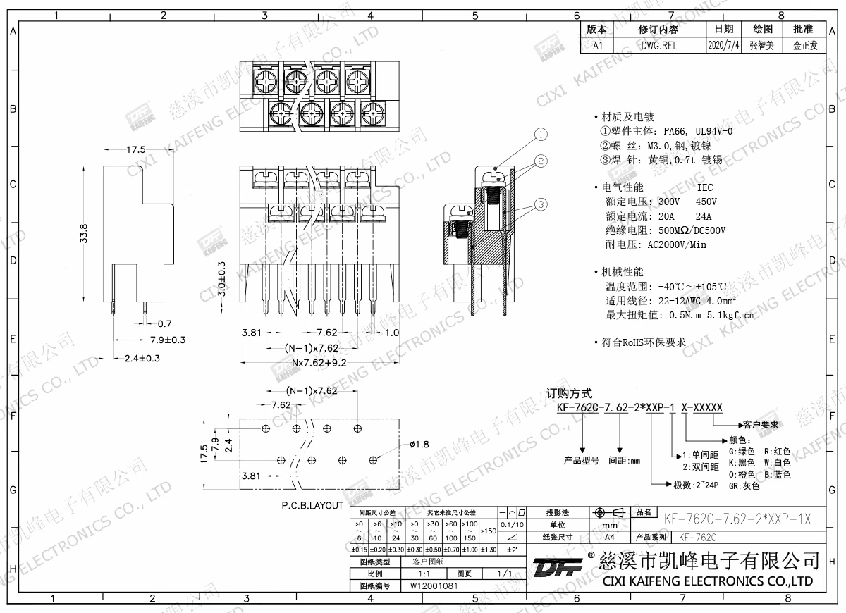 材质电镀:材质及电镀(Material)螺丝(Screw):M3.0,钢,镀镍Steel,NiPlated端子(Pinheader):黄铜,0.8t镀锡Brass,Tinplated塑件(Housing):PA66,UL94V-0·电气性能(Electrical)额定电压(RatedVoltage):300V额定电流(RatedCurrent):20A绝缘电阻(InsulationResist