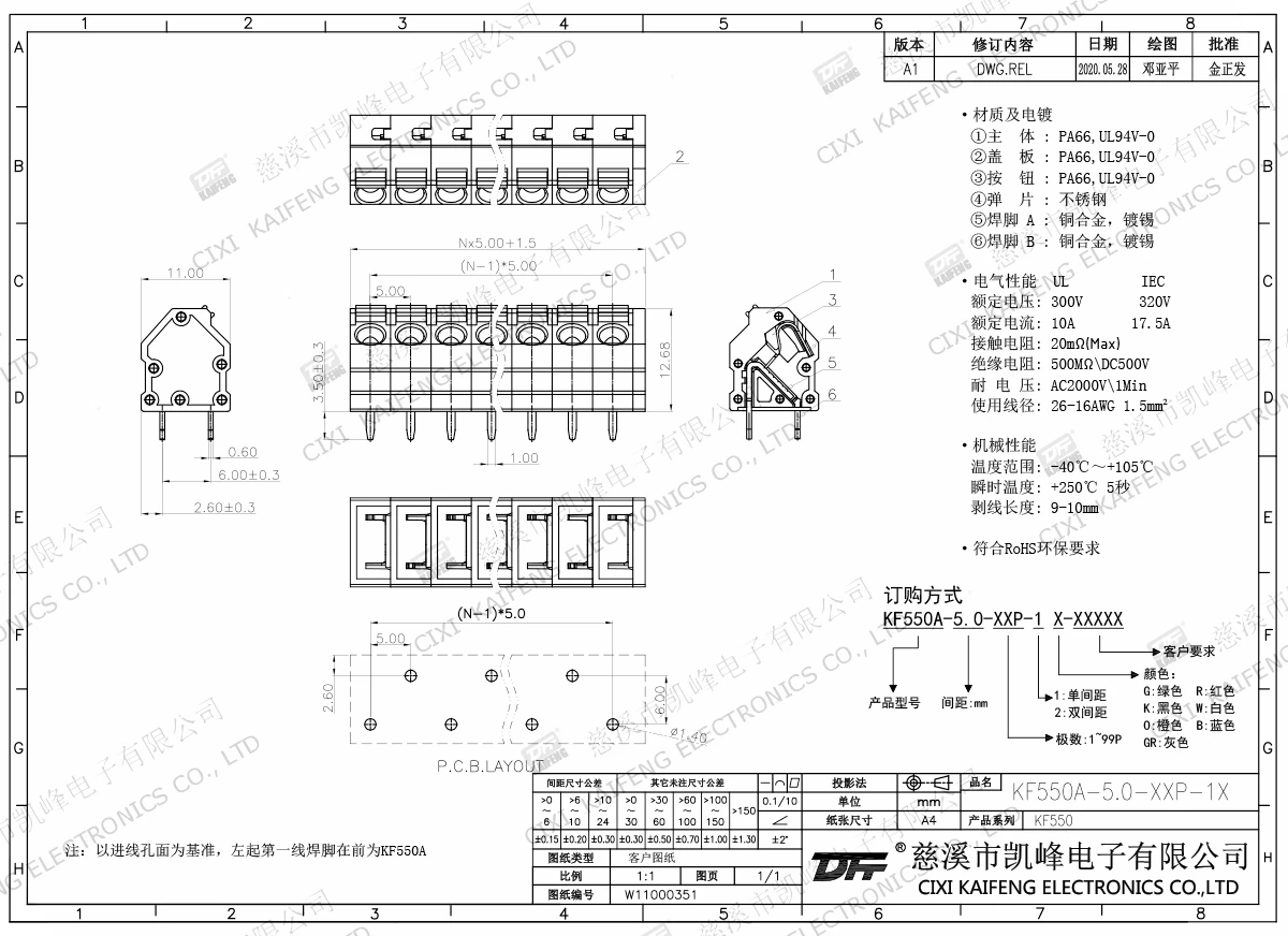 免螺丝式接线端子 材质电镀:材质及电镀①边件:PA66,UL94V-0②中间件:PA66,UL94V-0③盖板:PA66,UL94V-0④按钮:PA66,UL94V-0⑤弹片:不锈钢⑥长焊脚:紫铜,镀锡⑦短焊脚:紫铜,镀锡电气性能ULIEC额定电压300V 320V 额定电流10A17.5A接触电阻20mΩ绝缘电阻500MΩ/DC500V耐电压AC2000V/1min使用线径26-16AWG 1.5mm²